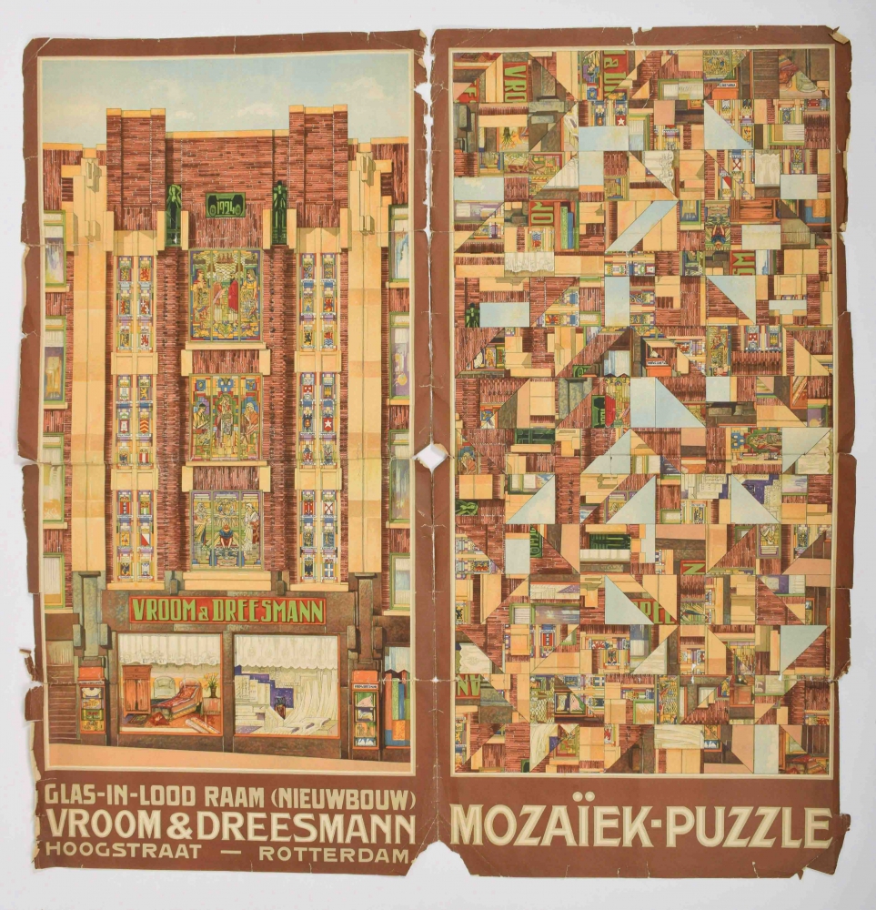 Cut-out jigsaw puzzle with on one side the cut-out parts, on the other side the complete picture with the facade of the building, issued for the official opening of the newly rebuild Vroom & Dreesmann stores on Hoogstraat, Rotterdam.