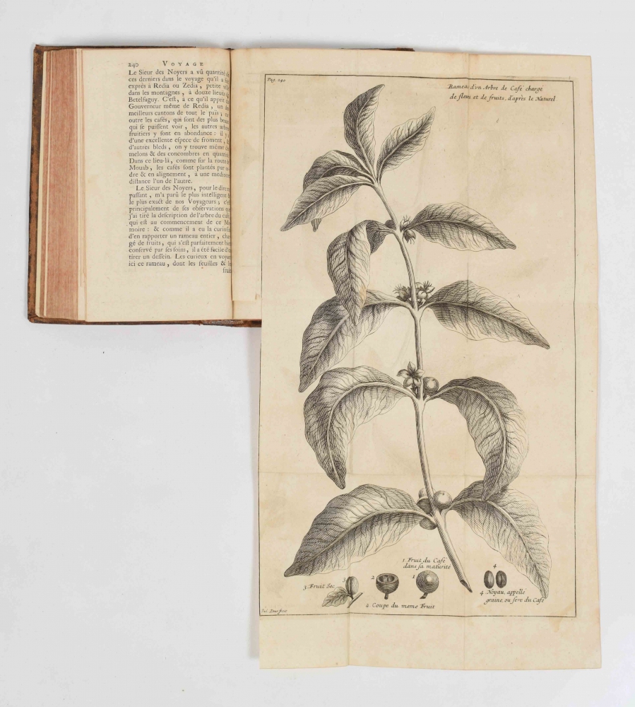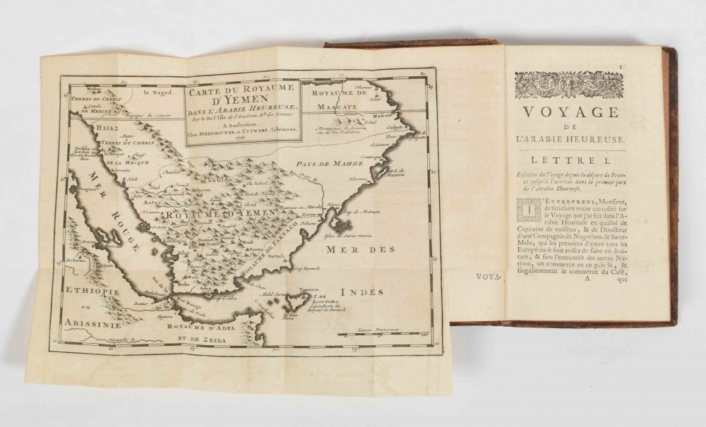 Heureuse, par l'ocean oriental, & le Detroit de la Mer Rouge. Fait par les Francois pour la premiere fois, dans les annees 1708, 1709 & 1710. Avec la relation particuliere d'un voyage du Port de Moka a la Cour du Roi d'Yemen, dans la seconde expedition des annees 1711, 1712 & 1713. Un memoire concernant l'arbre & le fruit du cafe... et un traite historique de l'origine & un progres du cafe. La Roque. Amsterdam, Steenhouwer & Uytwerf, 1716.