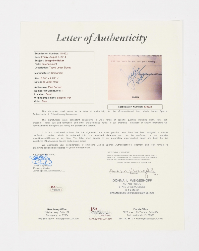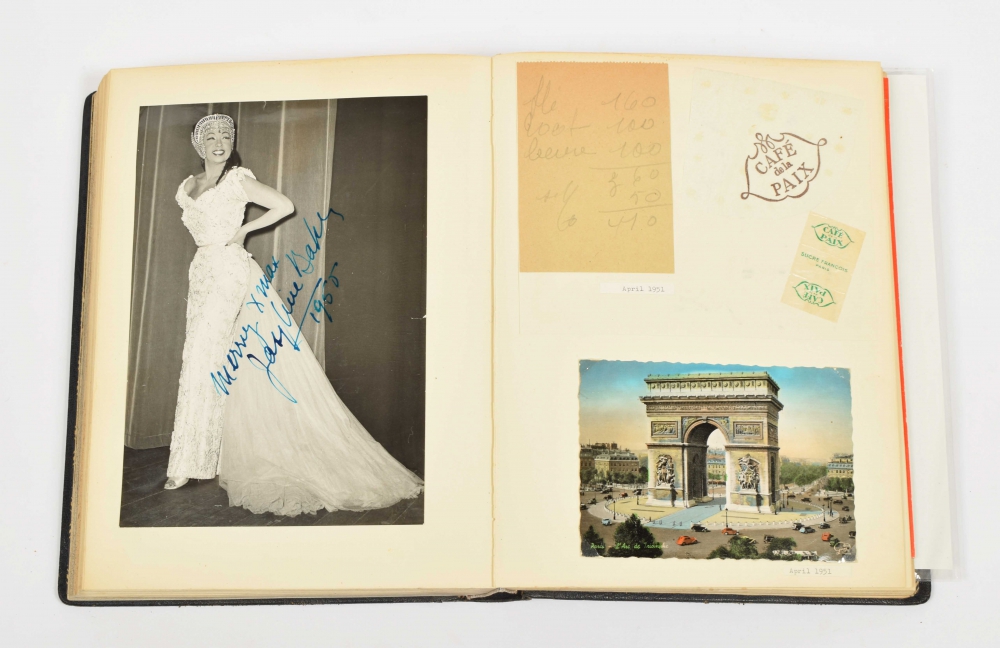 Danish travel account 1955. Volume consisting of: Paris, André Martin, Spring Books, London, 1963. 160 p.; typoscript of the voyage in Danish, 29 p., 75 pages with photos and souvenirs such as programmes, admission tickets, napkins etc. Incl. 3 signatures of Josephine Baker from 1955 - and 2 periodicals.