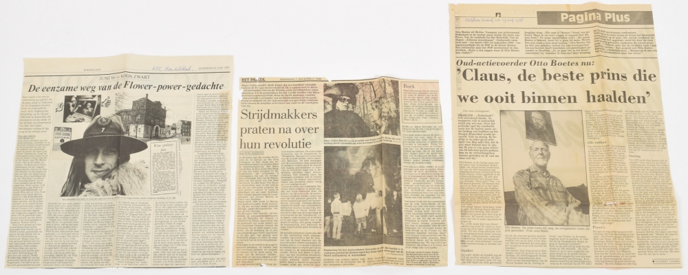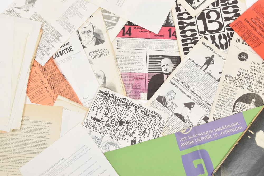 Archive with 11 Provo pamphlets such as Depressief erotisch panorama in Fantasio/Paradiso; Mobilisatie. Revolutionair Bulletin 1; In Holland staat un huis. Het witte huizen plan and Provo bulletin 'Spaanse provoos' + 10 pamphlets conc. the occupation of the Maagdenhuis, 1969 + posters Bericht vanuit het Maagdenhuis - and 2 more conc. this occupation (all sl. creased/ discoloured) + Provo no. 8, 12, 13 and 14 + no. 5, 1967 God Nederland & Oranje (small water stain) + Image no. 7 and 8 + 2 nos. of de Teleraaf, 1 no. of Het Pariool, article from The Observer Magazine, June 31, 1966, by Lord Reay - and various newspaper articles on Provo and the Maagdenhuis.