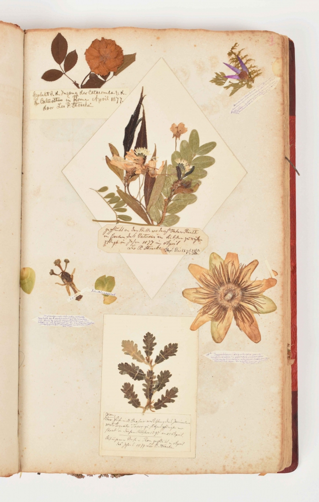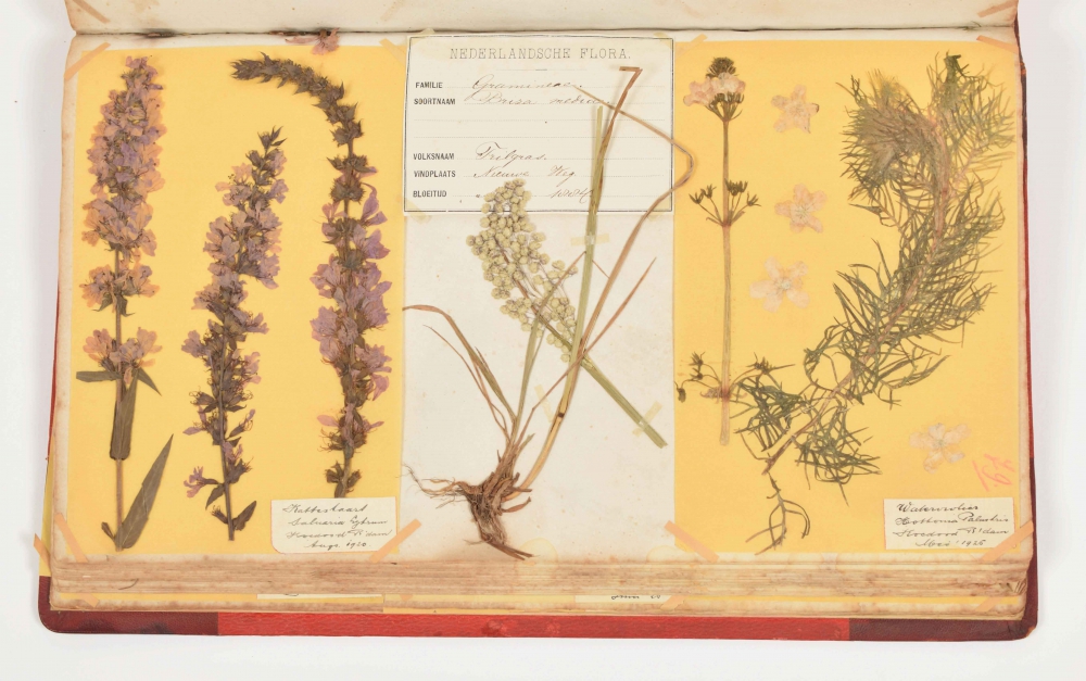 Album with dried flowers and plants, collected by Stracké (1885-1954) between c. 1883 and 1929. Plants mostly with card with name in Dutch and Latin, location of presence and date of gathering. On 1st leaf also flowers collected by her father Leo P. Stracké (1851-1923), graphic artist, sculptor and restorator, of Rotterdam, in 1877. Folio, halfleather. 101 one-sided pp.