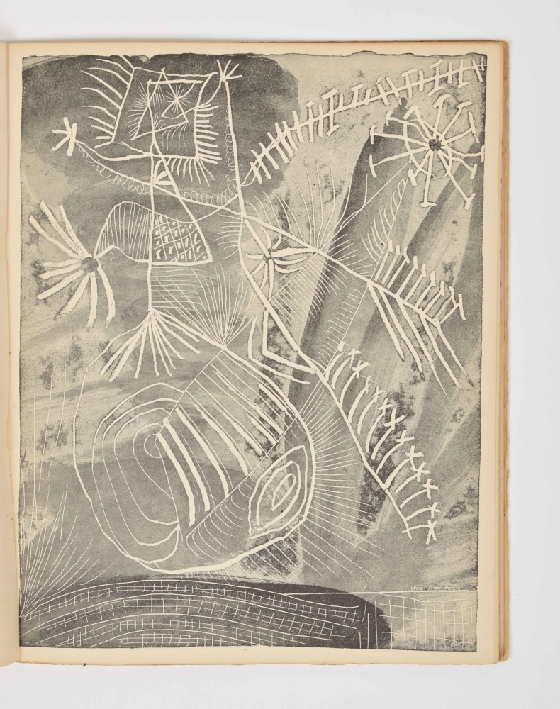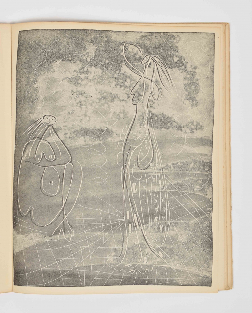The soiled and sl. tanned wrapper lacks a large part of the paper across the spine and is torn on the folds of the flaps. With lovely dedication in pen by Georges Hugnet to the half title: "À ma petite Joëlle en souvenir de tant de chansons en lui souhaitant pour ses seize ans d'être aimée comme la chèvre-feuille un jour - bientôt demain si possible. Avec toute la tendresse passée et présente de Georges-Bleu. G.H. 4/2/1945." Also with pencil drawing by Hugnet in the margin of the second poem (with the name Joelle in the same handwriting and the dedication). And with 1 more on Picasso. (total 2)