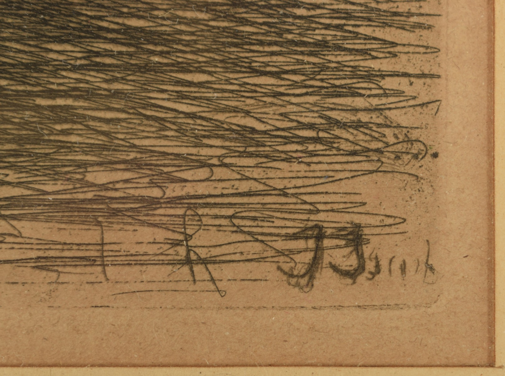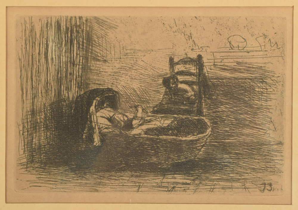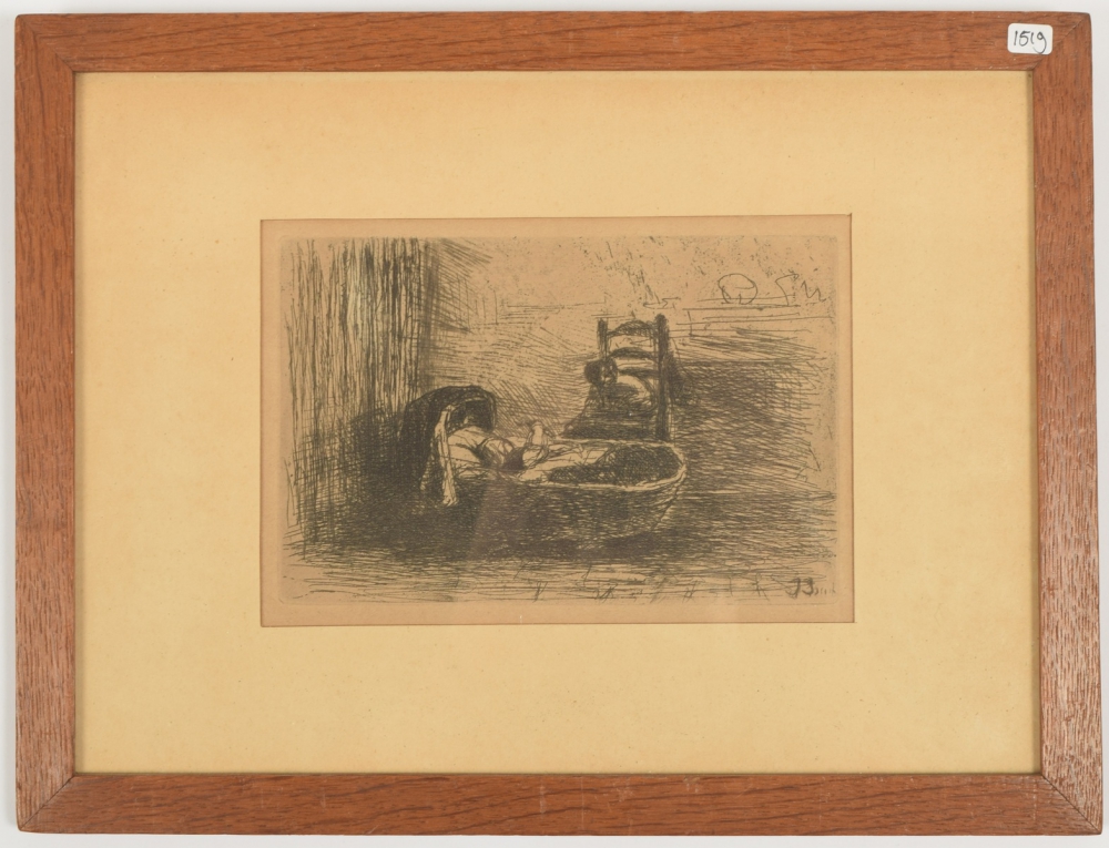 Child in cradle. Lithography, signed in plate. Framed in mount. Image 15 x 10 cm.