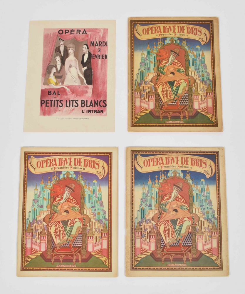 The wrapper of 2 copies sl. tanned/ foxed and some wear to spine. Very rarely offered as a set, we traced other titles from the series, but the total number of titles remains unknown to us. Deluxe, profusely illustrated programmes for the operas Prince Igor (music by Borodin, with a pasted change in the names of both lead roles), Tsar Saltan (music by Rimsky-Korsakov) and Snegourotschka (also with music by Rimsky-Korsakov). Added: lithographed opera poster. (total 4)