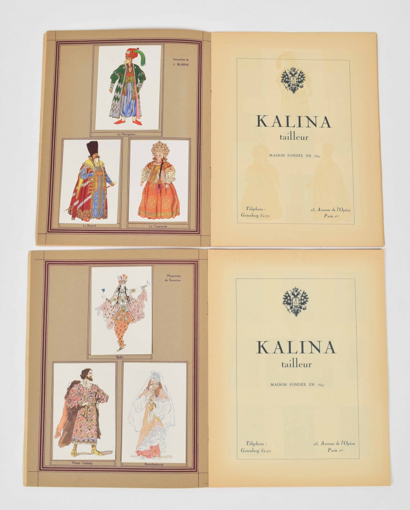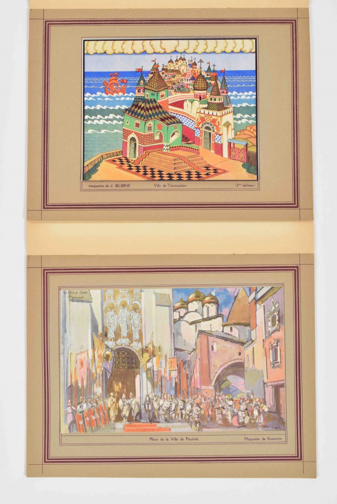 Three profusely illustrated programmes, each (36) p., the general pages, the advertisements, a loosely inserted flyer and the wrapper after Bilibin all exactly the same, but issues otherwise differing in the central double-page programmes, the analysis of the opera, the mounted plates after Korovine and Bilibin and one printed page with illustrations after Korovine and Tchezo-Potocka, original stapled wrapper, folio.