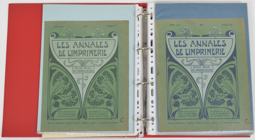 ± 75 wrappers of printer's publications, 1901-1910. Incl. Les Annales de l'Imprimerie. Revue Belge de l'industrie de livre. ± 36 nos., 1901-1909 and Papiers et Cartes en gros. Louis Muller, Paris. ± 15, 1900-1910 + ± 100 beautifully designed letterheads of the aforementioned printers and others.