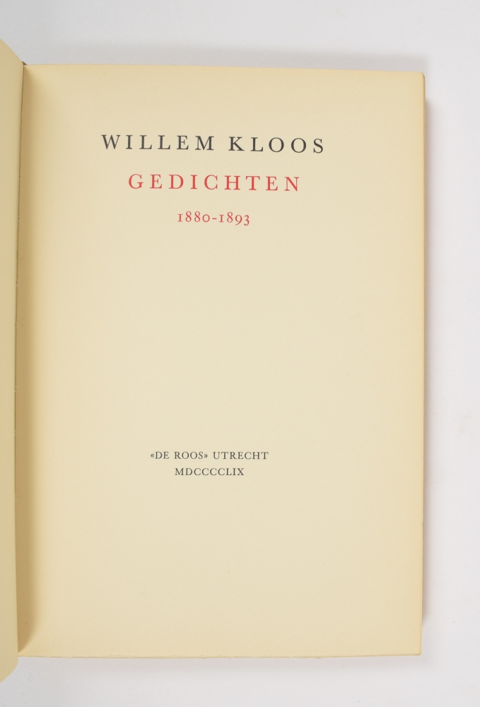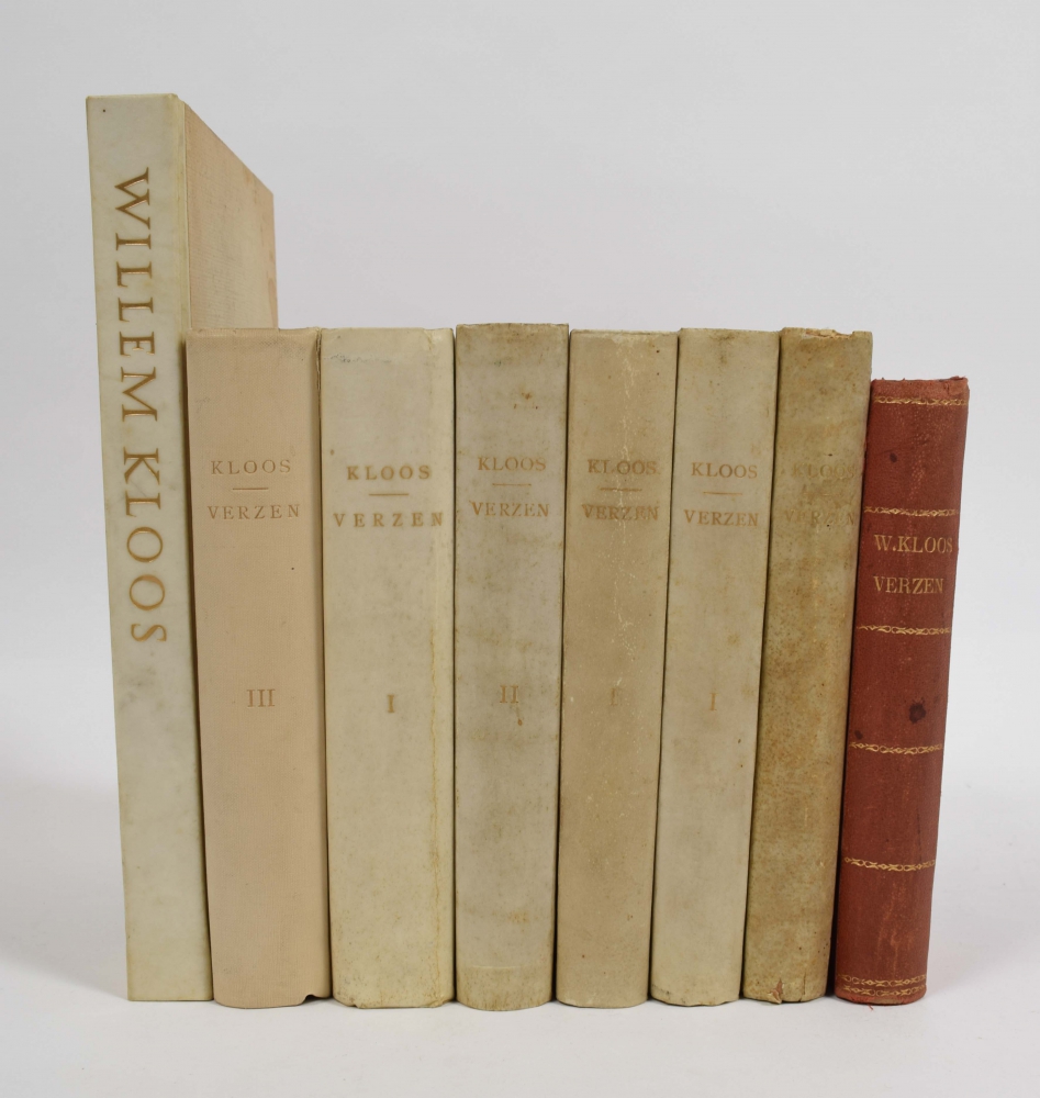 Gedichten, 1880-1893. De Roos, Utrecht, 1959. Edition of 175. Halfvellum, gilt spine, 27 x 19 cm. 197,(3) pp. Binding with water damage, else good + Verzen I-III. W. Versluys, Amsterdam, 1894-1913. 3 vols. Vellum (vol. III cloth) with gilt title. 8vo, 262, 288, 370 pp. Light traces of use, small tear to binding vol. III, else good - and 4 more.