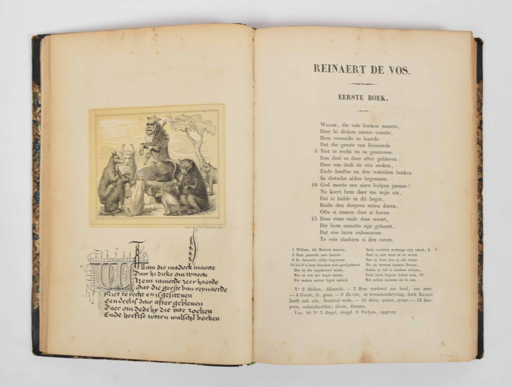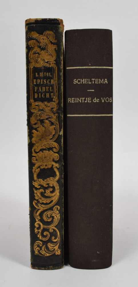 Reinaert de Vos, Episch fabeldicht van de twaelfde en dertiende eeuw, met aenmerkingen en ophelderingen van J.F. Willems. Ghent, Gyselynck, 2nd ed., 1850. lxvii, 404 p. In halfmorocco with gilt spine title. Some edgewear, else clean copy + Reintje de Vos van Hendrik van Alkmaar. Naar den Lubekschen druk van 1498 vertaald en uitgegeven door Mr. Jacobs Scheltema. Vincent Loosjes, Haarlem, 1826. lxxii, 468 p. 4to, rebound in cloth with renewed endpapers.