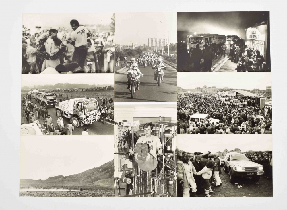 (1-35) Series of 35 b/w photos of various editions of the rally (mostly the 10th), each 20 x 30 cm., with printed information on reverse, numbered and dated January 1983 to (but mostly) January 1988, photos for Sygma by Isabelle Bich, Moto Journal, Jean Guichard, A. Nogues, P. Boulland and Bourseiller.