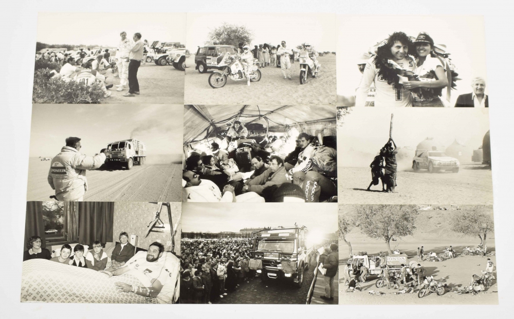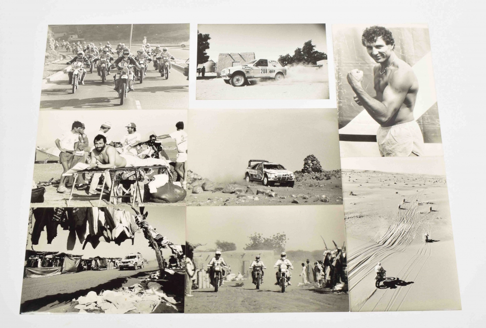 (36-43) Similar series of sl. smaller b/w photos, 18 x 27 cm., with similar printed information on reverse, 1987-1988, photos for Sipa Press by Stephane Compoint, Christian Lacombe and De Nobel. And with 1 other photo of the route of the 10th Paris-Dakar Rally. (total 43)
