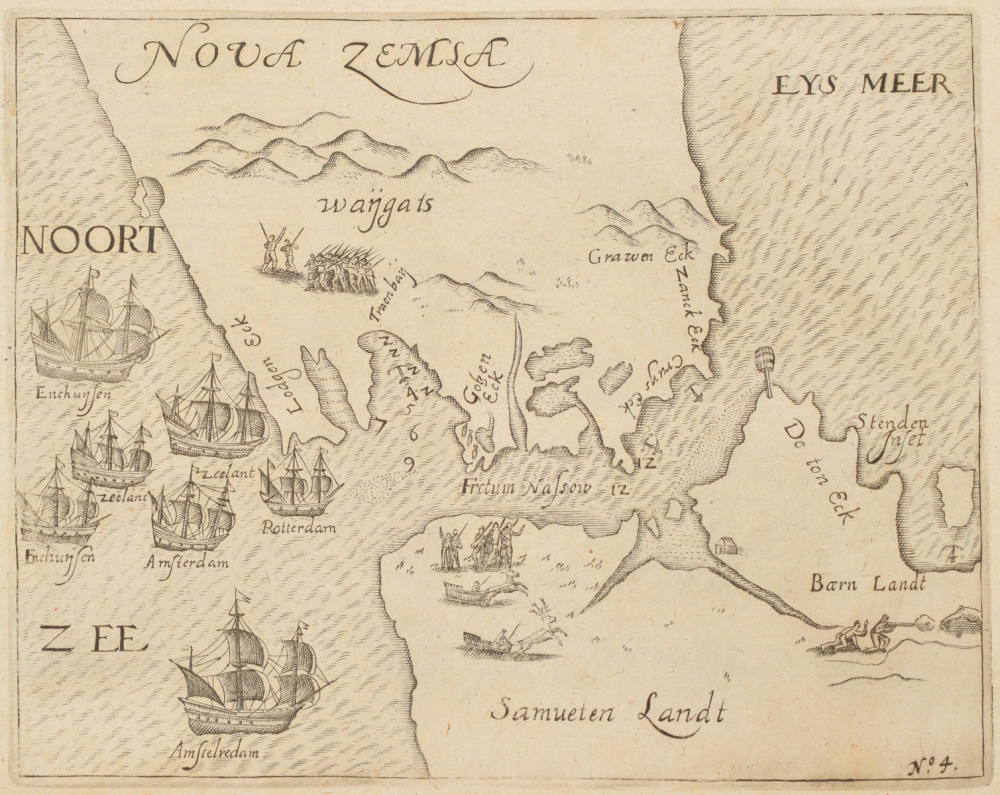 Part of: Begin ende Voortgangh... by Isaak Commelin. Amsterdam, 1645 [6 maps, 26 images (numbered 0 to 31; no. 9 numbered as 10)]. Also contains the 2nd voyage 1595 and 3rd voyage 1596-1597 (Willem Barentsz); 4th voyage 1609 (Henry Hudson); Beschrijvinghe van de Landen Siberia, Samoyeda ende Tingoesa; Discours Johannis Isaaacius Pontanus. See KB PiCarta. The classic first voyage of Willem Barentsz searching for the Northeast Passage to the Orient.