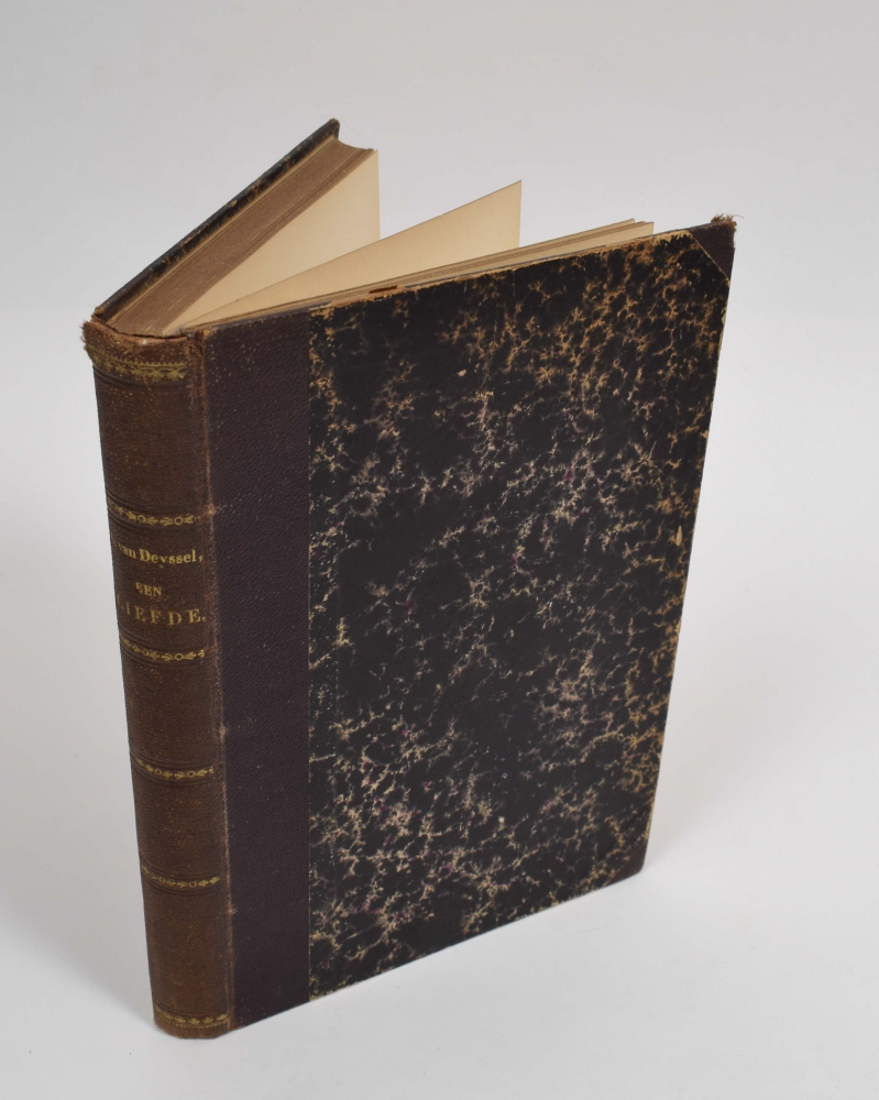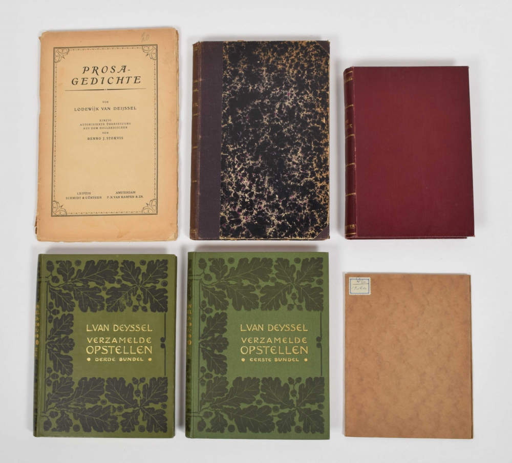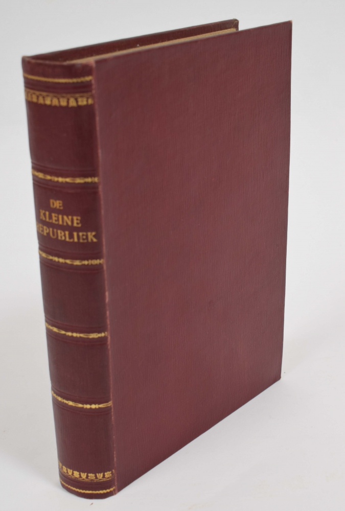 De kleine republiek. Deventer, P. Beitsma, 1889, 1st ed., 2 parts in 1 vol., 334;270,(4) p., maroon cloth with gilt spine. Corners sl. bumped, else good + Een liefde. Amsterdam, C.L. Brinkman, (1887), 1st ed., 2 parts in 1 vol., 205,190,(2) p., halfleather with gilt title + Wederzien, toneelspel in een bedrijf. Grand Théâtre, Amsterdam, 10 april 1883. 49 p., plain wrapper, 12mo. Library stamps, name and inscription to title page, several small marginal tears - and 3 more.
