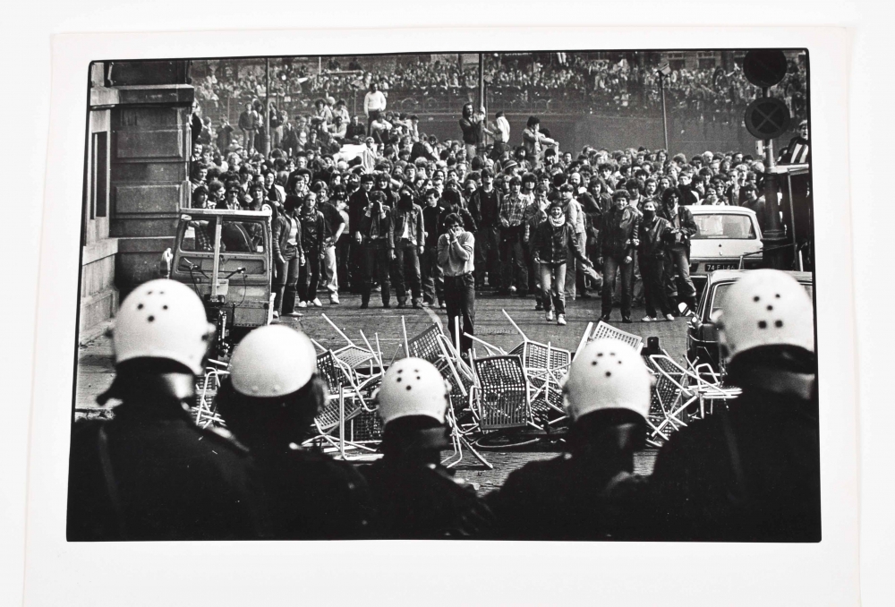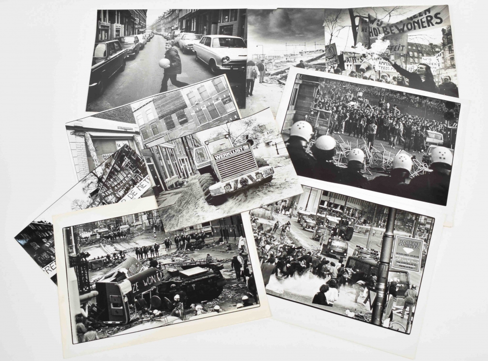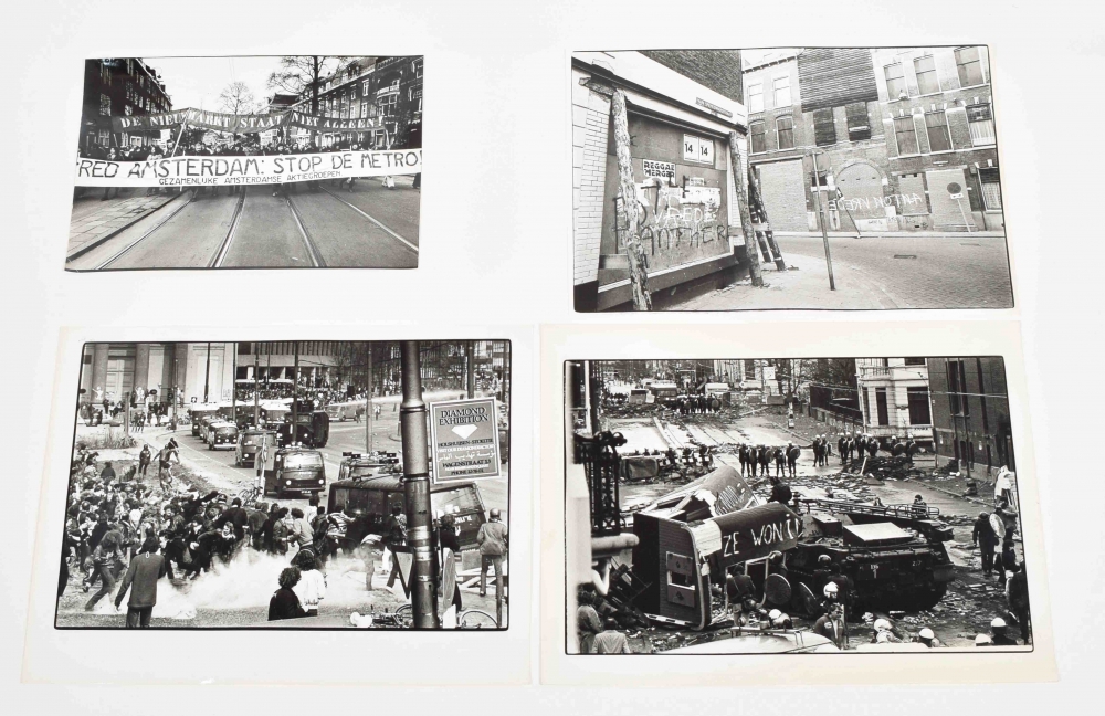 Amsterdam protests, 1980s. 4 photos of protests conc. housing shortage in Amsterdam, c. 1980. One with photographer's stamp of Willem Diepraam. Gelatin silver print, 30 x 40 cm. and 3 from the same series, without stamp + Metro protest. Bert Nienhuis. 21 x 31 cm. - and 4 more.