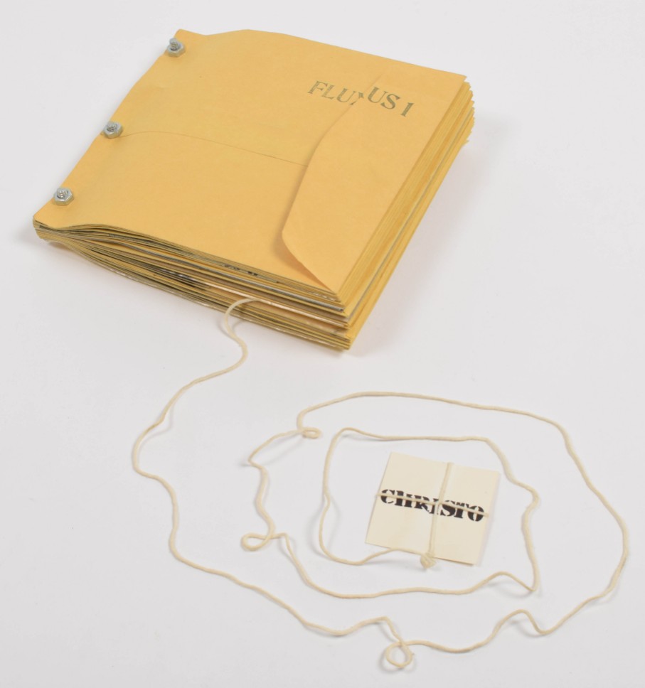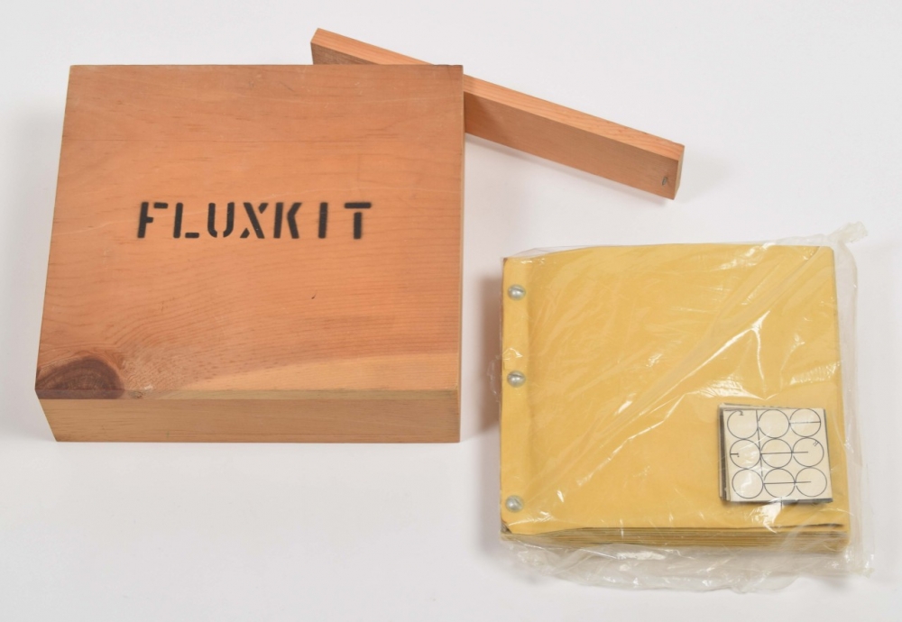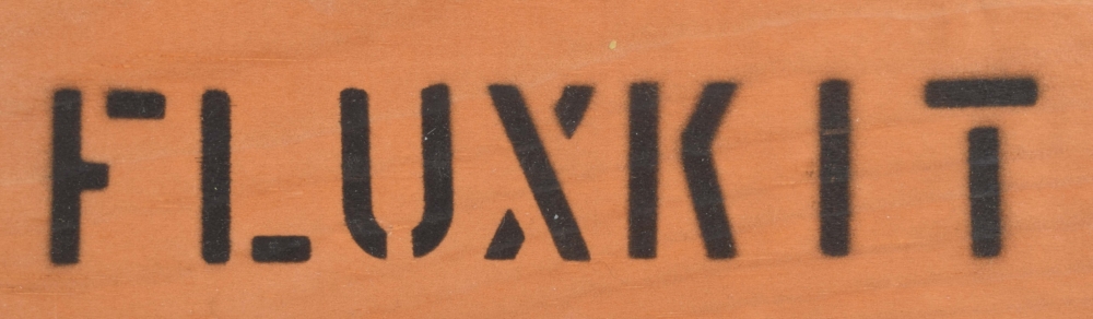 Assembled, designed and produced by George Maciunas. Anthology of flat objects by Fluxus artists in envelopes bound together by three metal bolts. 19 x 21 x 4 cm. Housed in a wooden mailing crate (25.5 x 23.5 x 7.5 cm) which has the title 'Fluxkit' sprayed on it. Contains 16 envelopes with printed matter or small objects enclosed intermixed with around 50 leaves, partly printed on transparent overlays.