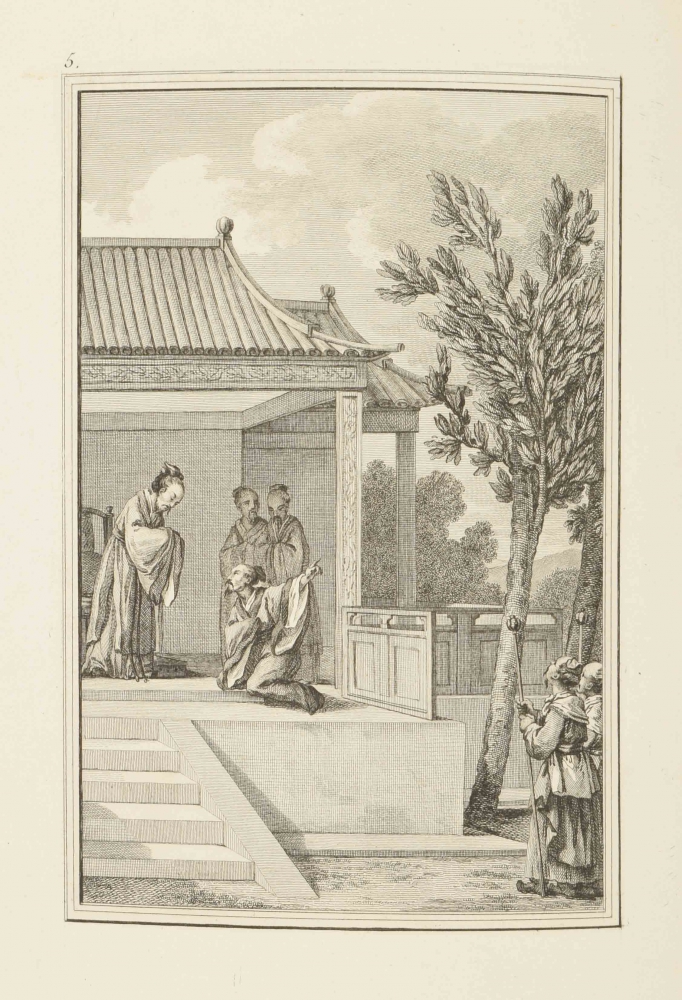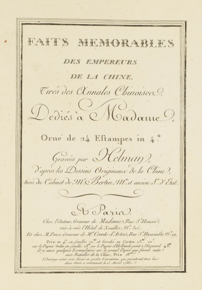 tirés des annales Chinoises, dédiés à Madame, orné de 24 estampes in 4o. Gravés par Helman, d'après les dessins originaux de la Chine tirés du Cabinet de Mr. Bertin (...). Paris, "chez l'auteur, graveur de Madame"/ M. Ponce, 1788, engraved title page, dedication and 24 plates each with facing engraved text leaf, original (?) cardboard with manuscript title on front board, 4to (31 x 23 cm.).