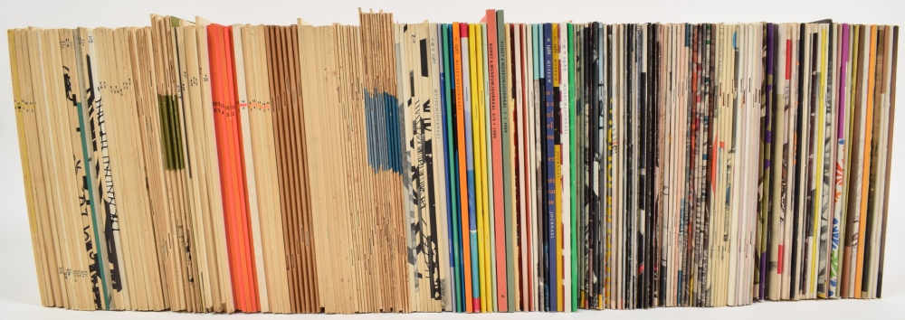Complete series of 211 nos. between series 2 no. 3/4, 1957 and no. 2/3, 1989 + Kunst & Museumjournaal nos. 1 and 2/3, 1989. Incl. series 9 no. 5/6, with original wrapper by Lucio Fontana with central medallion in black surrounded by 24 punctured holes, signed "L Fontana 64" in print, and blue multiple by Yves Klein; series 9 no. 1 (with wrapper by Kandinsky); series 9 no. 8 (wrapper by Roy Lichtenstein); and series 10, no. 9-10 (with loose, plastic multiple after Vasarely).