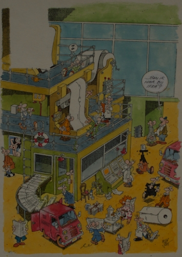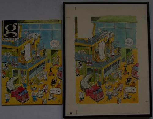 This item contains no English description. See the Dutch description: Gepubliceerd als voorkant van het blad Graficus, 12 oktober 1989. " ..Ben ik hier bij Ifra" Full colour, gemengde techniek. 31 x 22 cm. In lijst.