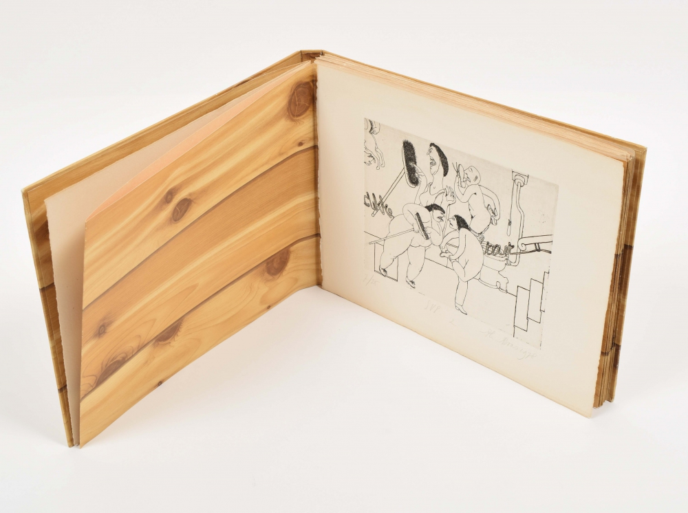 13 etchings, 1978. Each ± 16.5 x 21 cm, loosely inlaid in handmade leporello book, cardboard with wood printing, 25 x 35 cm. Edition of 25 copies, this is no. 7.