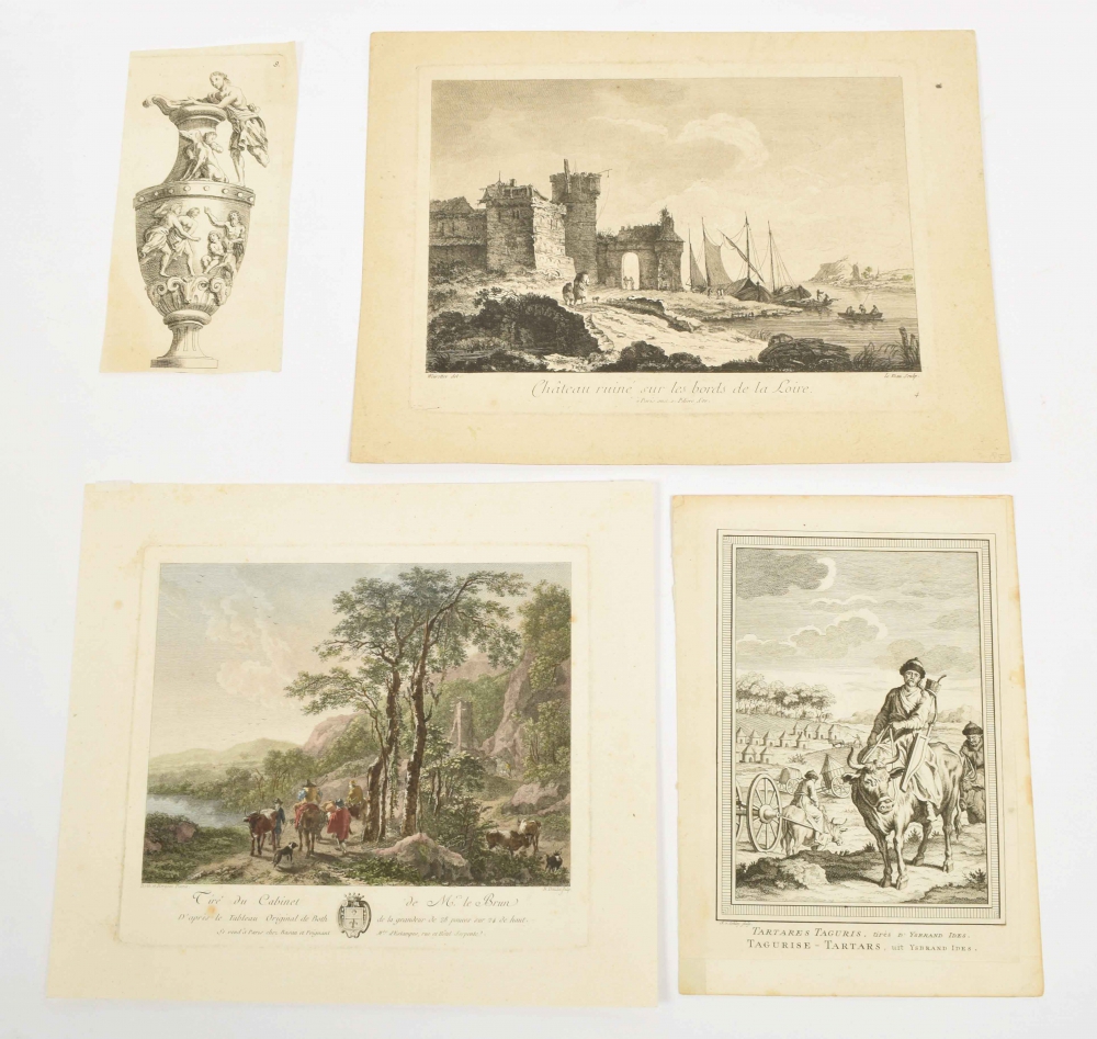 Contains prints by or after P. de Bailliu, Brenet, A. Caracci, I.A. Friderich, G. van der Gouwe, A. Houbraken, G. Metsu, C. Motte, M. Mourot, B. Picart, Le Potre (series of 12 engravings issued by Le Blond), P. Potter, N. Poussin, H. Quellinus, Rembrandt, Ch. Rochussen, Rubens, David Teniers, A. van de Venne and Ph. Wouwermans.