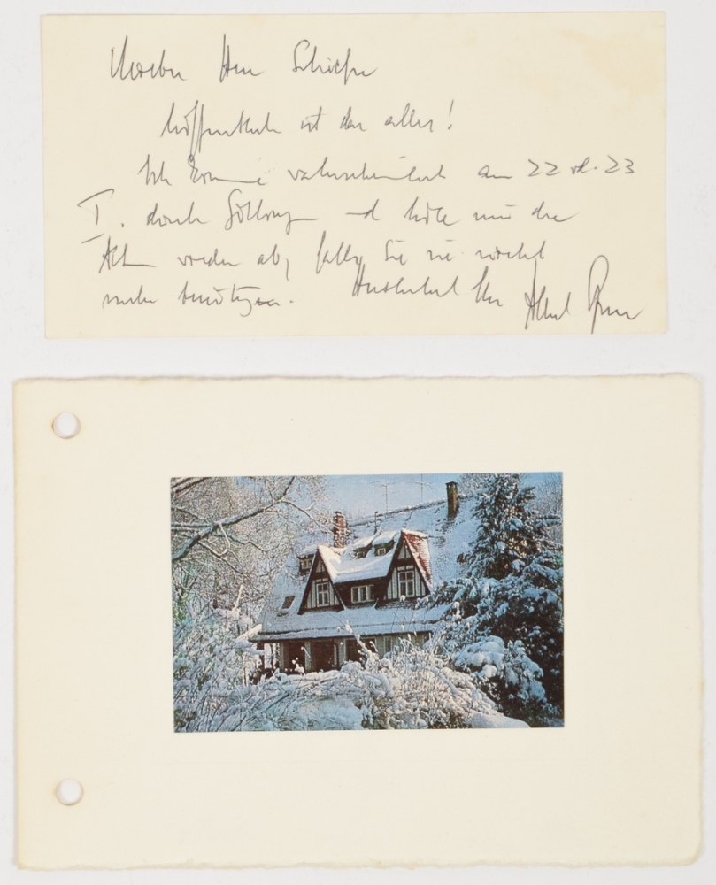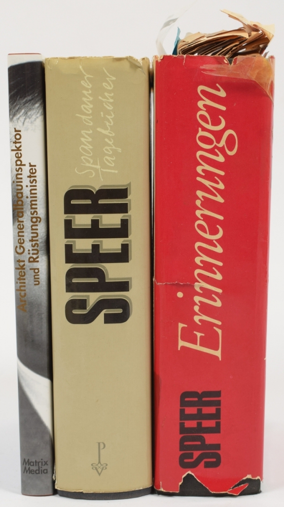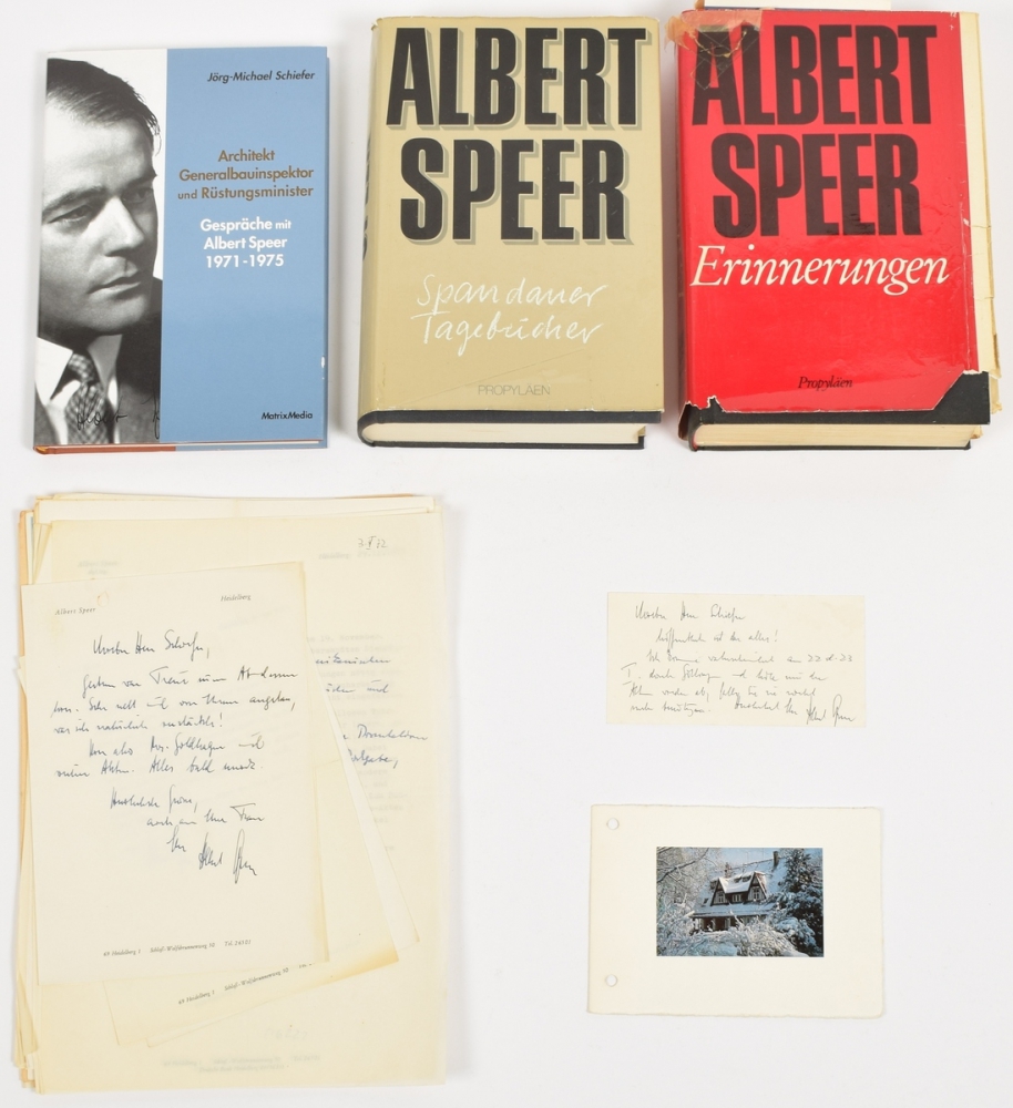 (1) Jörg Michael Schiefer, Architekt, Generalbauinspektor und Rüstungsminister. Gespräche mit Albert Speer 1971-1975 (2013, 150 p.). No copies in PiCarta; (2) Memory stick containing the (chilling) recordings of the actual conversations; (3) The 1964 interview with Der Spiegel corrected by Speer, in which Speer once again declares to have only "swum along," but cannot be held politically responsible: "I was only a technocrate". On an else blank leaf of the interview Speer's business card has been mounted, with a short, signed annotation in pen. The interview is depicted in Schiefer's book, on pp. 40-41; (4) Series of 19 letters by Speer to Schiefer, dated 1971-1978, all but one on his stationery, 2x entirely manuscript and the remainder typed, all signed; (5) Two manuscript cards by Speer to Schiefer, incl. a Christmas card, both signed; (6) Letter from Mrs. Siv Thiessen to Schiefer, with a copy of a letter from Speer to her, conc. reviews of a book by Speer; (7) Albert Speer. Spandauer Tagebücher (first edition 1975). With signed dedication by Speer to Schiefer on the half title; (8) Albert Speer. Erinnerungen (8th printing 1970). With signed dedication by Speer to Schiefer on the half title. Schiefer's working copy, with many underlinings, markings and annotations, many inserted strips with themes in pen such as "Technocratie".
