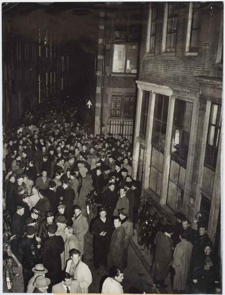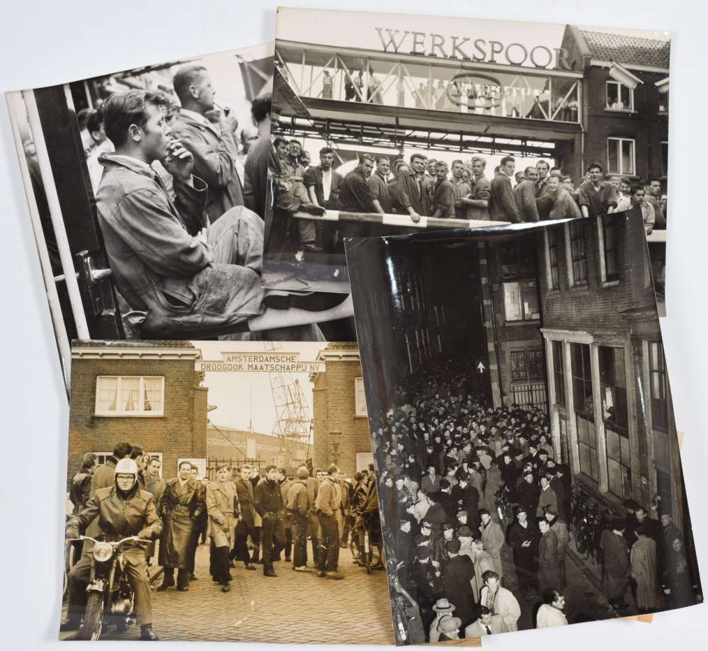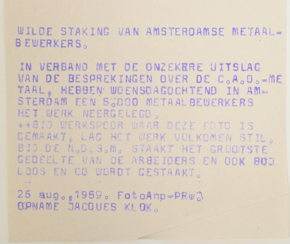 Wilde staking van Amsterdamse Metaal-bewerkers. (Wildcat strike by Amsterdam metalworkers). Photographer Jacques Klok, 26 Aug. 1959. Stamp Copyright ANPfoto on verso. Each 24 x 18 cm.