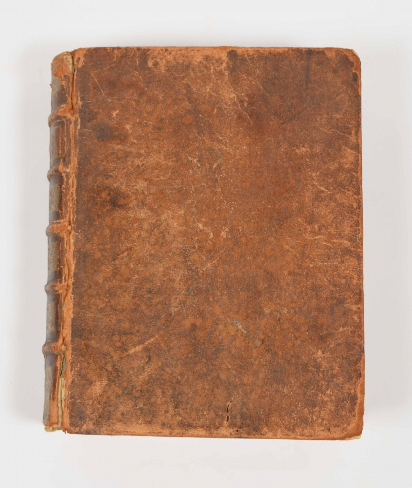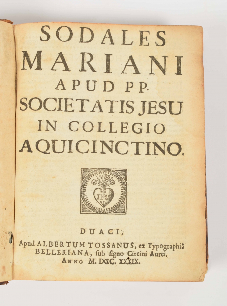 data a R.P. Firmino Murat e Soc. Jesu 1740. Manuscript of a lecture in Latin by Professor Murat at the Collegio Aquicinctino in Douai (French Flanders) preceded by a title and lists of professors and teachers at the institute in print. Leather, 4to, marbled endpapers, title in print: Sodales Mariani apud pp. Societatis Jesu in Collegio Aquinctino. Douai Albert Tossanus, ex typographia Belleriana, 1739. 8 pp., title in ms. inside illustrated and engraved border, 385, 399 and 204 pp. in ms., at the end a loose and damaged document with title Octo Libri Physicorum.