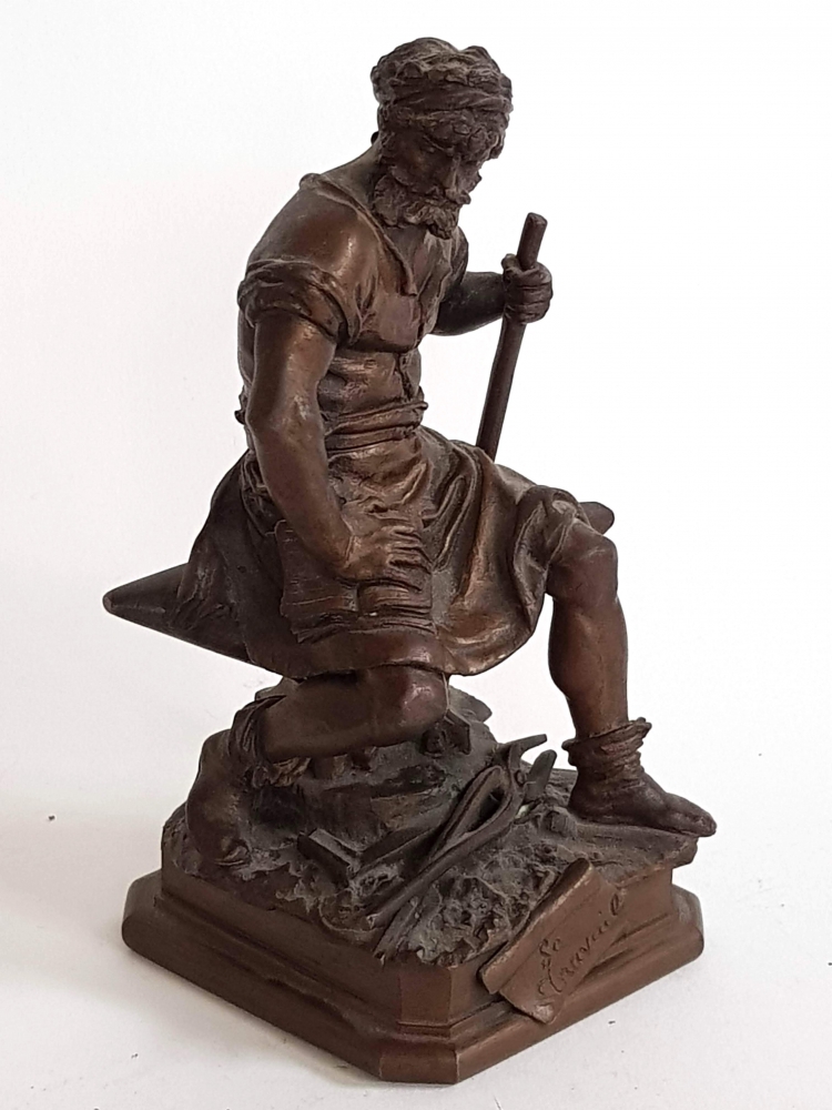 Bronze sculpture of blacksmith with hammer and tools on an anvil. Signed "Lebourg Acquis par la Ville de Paris". On back with coin Exposition Paris 1900 MD mlle d'or HV. Height 16 cm.