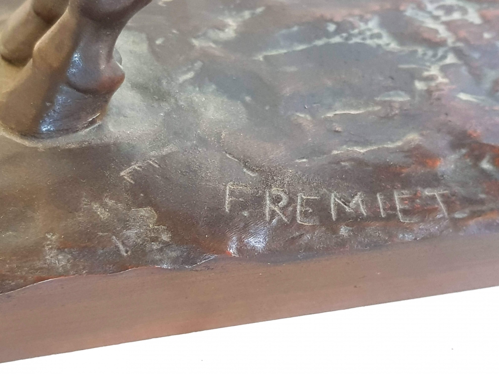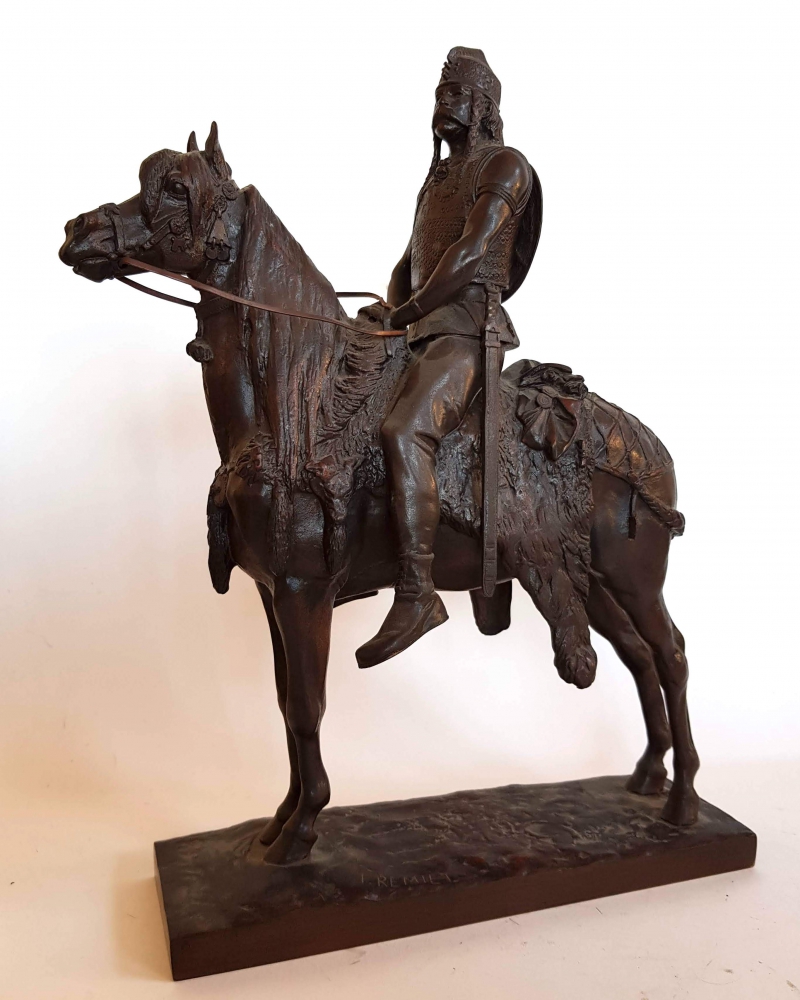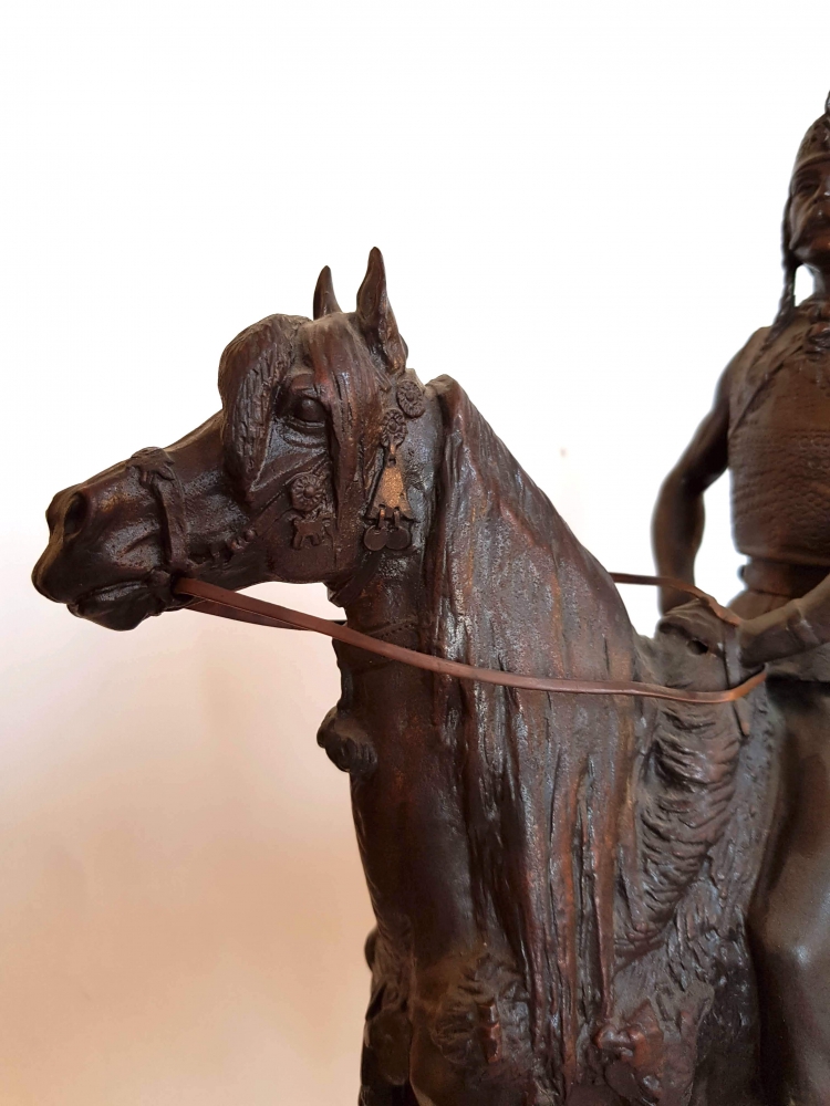 Bronze, with knight sitting on his horse with armament Chef Gaulois. Signed on base E. Fremiet. France, 19th century. Height 36 cm.