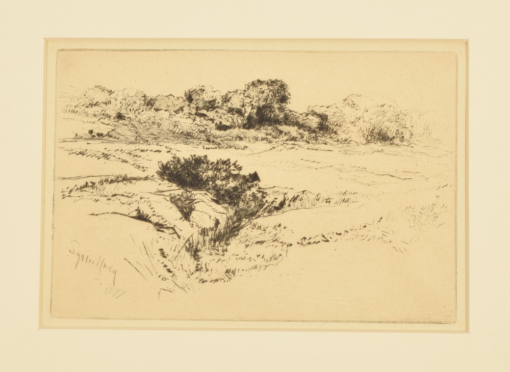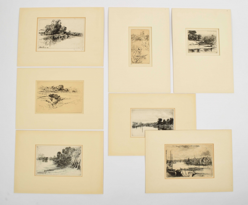 (1) Etching. Old Chelsea out of Whistlers window. 1863, signed in the plate. 15 x 22 cm., in mount. (2) Etching. Brentford Ferry. 1864, signed in the plate. 13.5 x 21 cm., in mount. (3) Etching. Newcastle in Emlyn. Signed in the plate. 11.5 x 14.5 cm., in mount. (4) Etching. Egham. 1859, signed in the plate. 12.5 x 20 cm., in mount. (5) Etching. The little Boat House. 1877, signed in the plate. 15 x 22 cm., in mount. (6) Windmill Hill No. 2. 1877, signed in the plate. 15 x 22 cm., in mount. (7) Bank Holiday Fishing. 1887. 17 x 9 cm., collector's stamp. In mount.