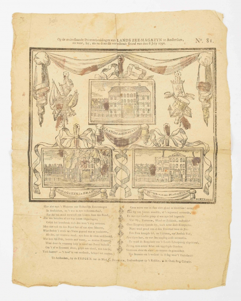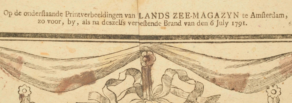 zoo voor, by, als na deszelfs verwoestende Brand van den 6 July 1791. Woodcut catchpenny print by Robyn, "No. 211" in upper right corner. Amsterdam, heirs of Wed. C. Stichter, c. 1791. KVCS, 2014 p. 795.