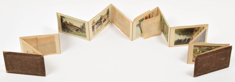 Leporello album c. 1880-1900 containing 12 coloured photos of geishas, on verso 12 coloured photos of street scenes and temples in Japanese cities (probably Kyoto). Photos each 9.5 x 13 cm mounted on cardboard. In good condition.