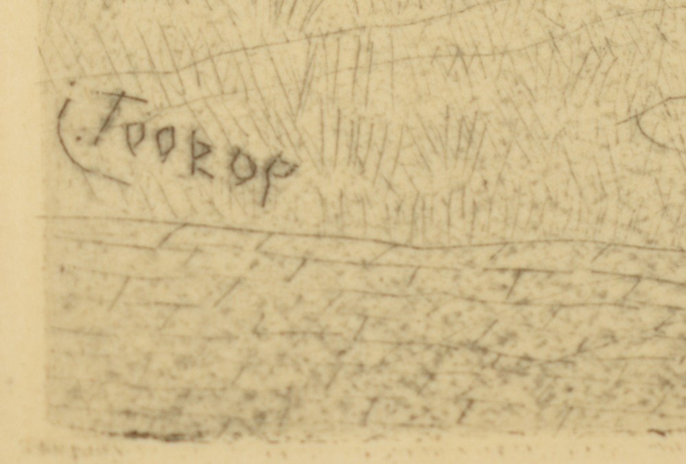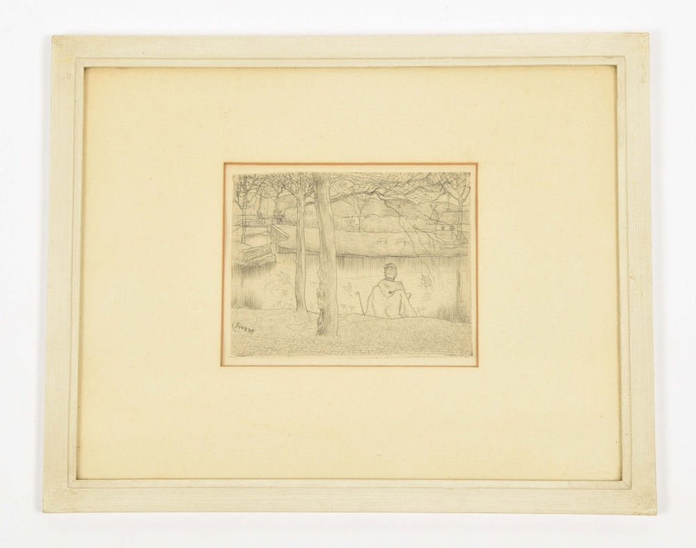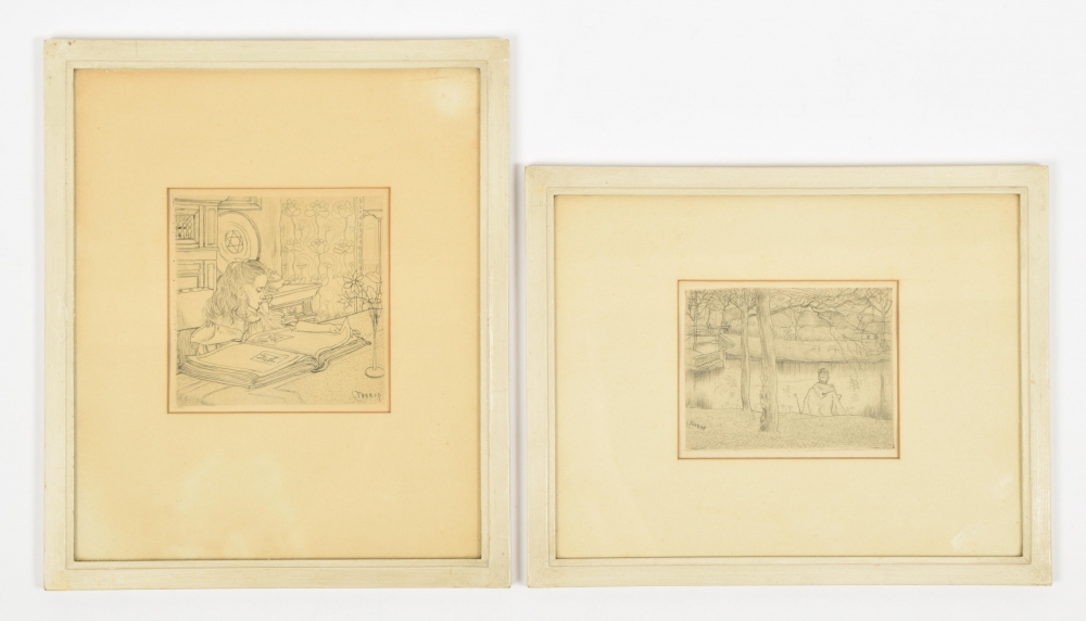 Two etchings: (1) Self-portrait as a girl with (photo?) album in room. 10 x 10 cm.; (2) Man at a lake. 8 x 10 cm. Both signed in the plate. Framed with mount under glass.