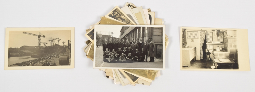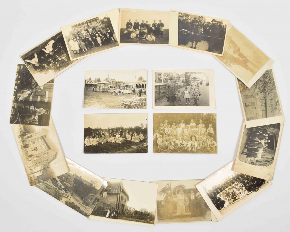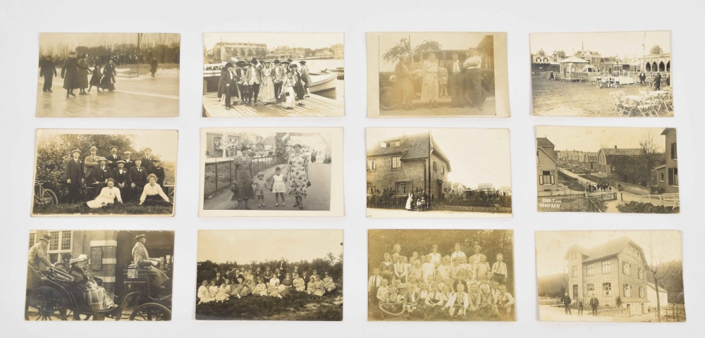 Lot with 25 photographic picture postcards. (1) Groningen festival grounds. (2) Greetings from Garderen. (3) Unknown building. (4) Fun on ice. (5) Family posing with their car. (6) Royal visit in carriage. (7) Construction site with 5 working cranes. (8) Hot air balloon Agfa Foto. With another 17 photographic cards.