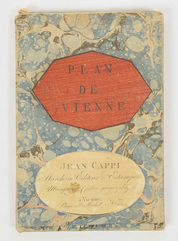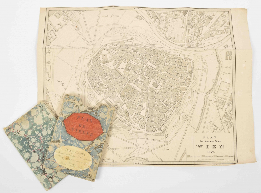 (1) Grundriss der Kaiserl. Königl. Haupt und Residenz Stadt Wien. Max de Grimm. Wien, 1809. Original coloured plan of Vienna in 18 segments on cloth with wrapper in cased cassette. Plan 50 x 65 cm with cartouche and 2x legend on the left. (2) Plan der innere Stadt Wien. Folded lithograph by Franz Orlitsek, 1826. Leaf 38 x 51 cm.