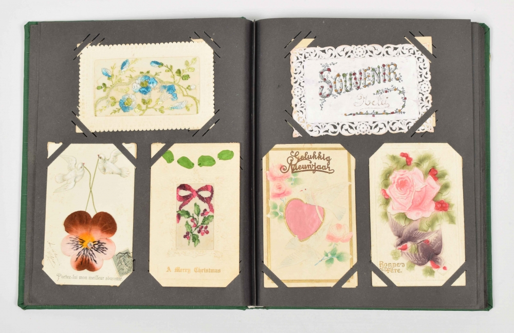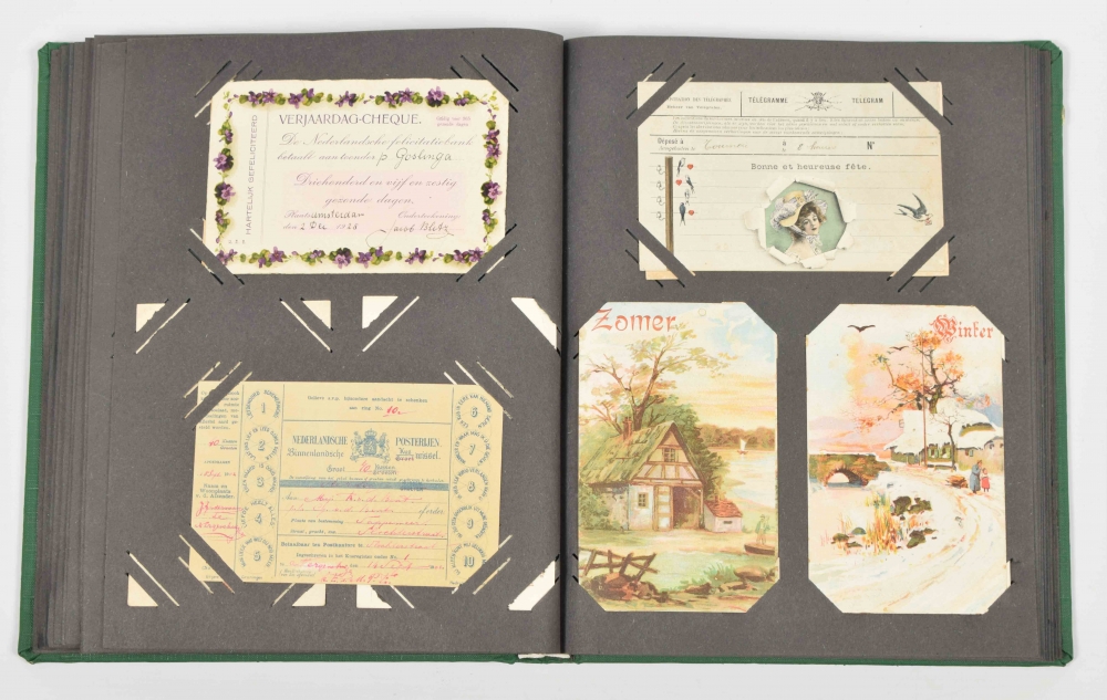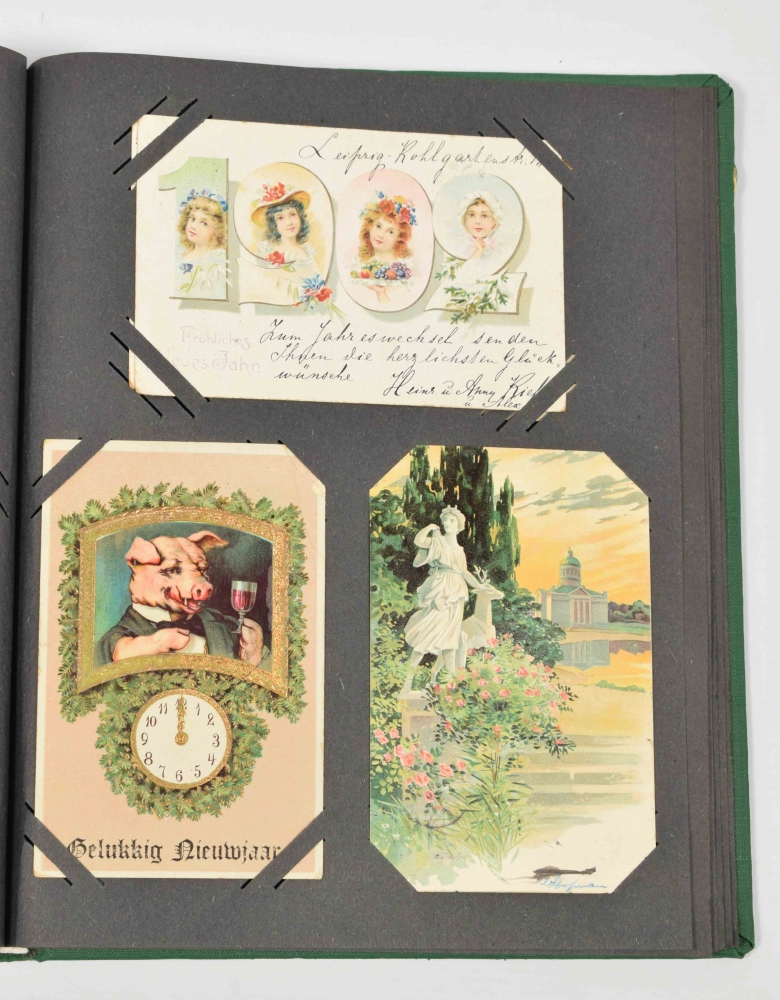 Album with ± 125 picture postcards. Various subjects such as years, celluloid cards, hands, months and seasons, embroideries, clocks and watches, etc.