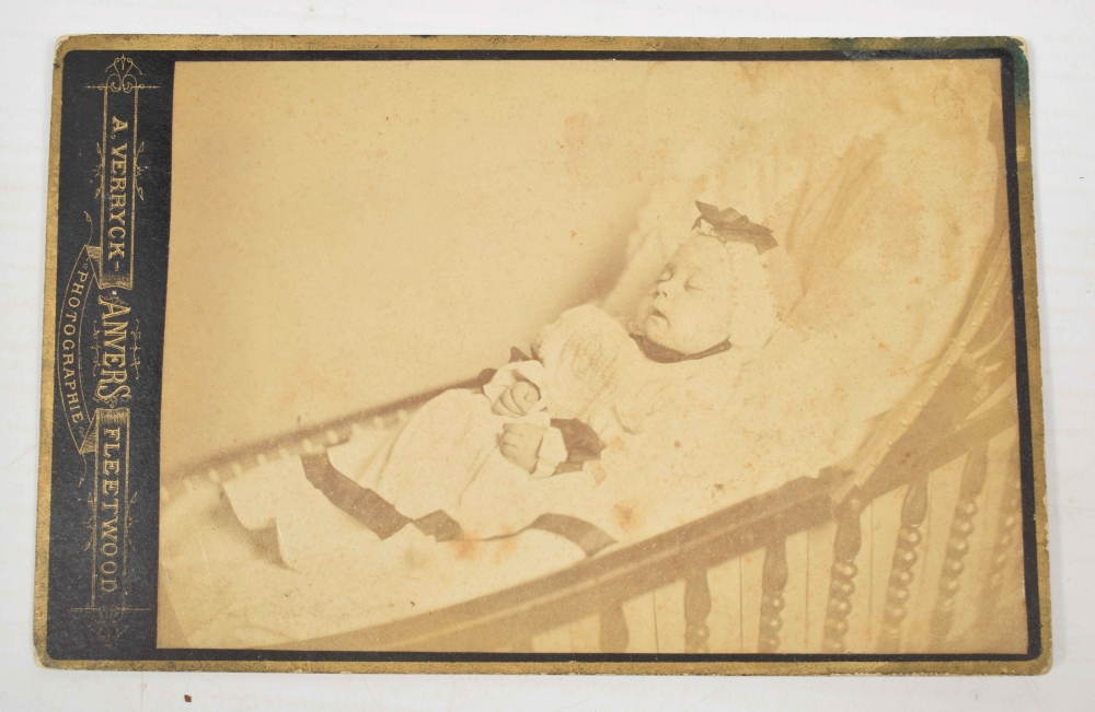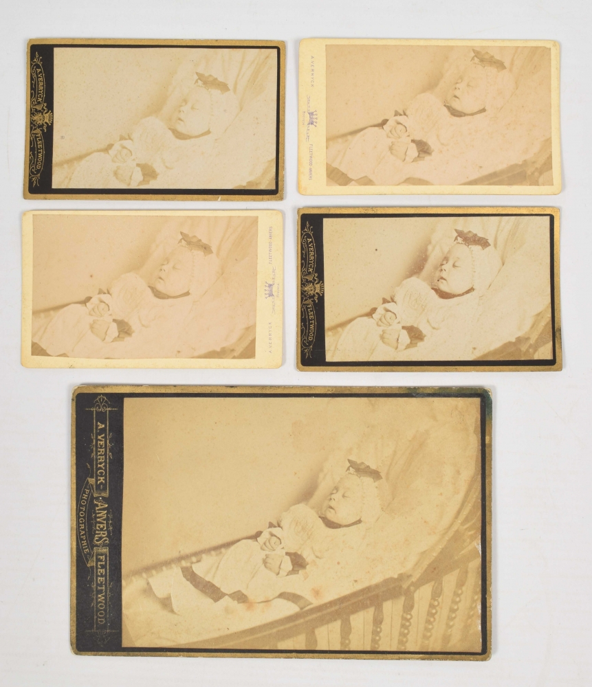 Each with image of a dead girl presented in bed. With a cabinet card with the same girl. Photographer A. Verryck Fleetwood, Antwerp.