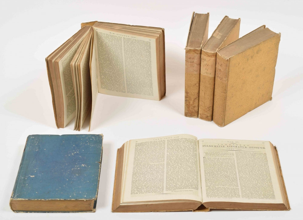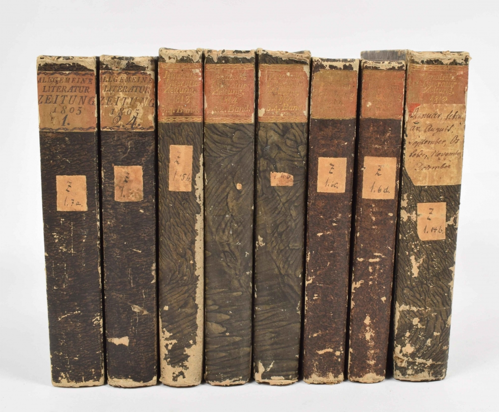 The first 11 years of this periodical of the German Romantics, founded by instigation of Goethe with contributions by him edited by Karl Abraham Eichstädt. The periodical was issued around six times a week. Additionally, there were the Intelligenzblätter, of which most are present here. Very well preserved set of this scarce publication. See Kirchner, Geschichte, I. (total 38)
