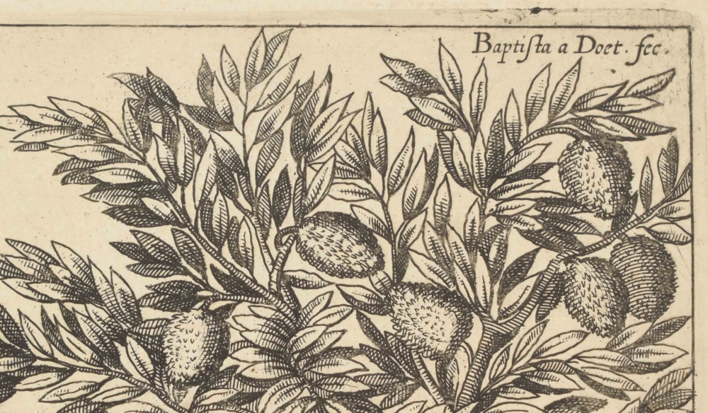 Engraving by Baptista van Doetecum (died 1611), 25 x 32 cm., signed in the plate upper left (Van Linschoten) and upper right (Van Doetecum), from an edition of Van Linschoten's Itinerario unknown to us (first issue 1596).