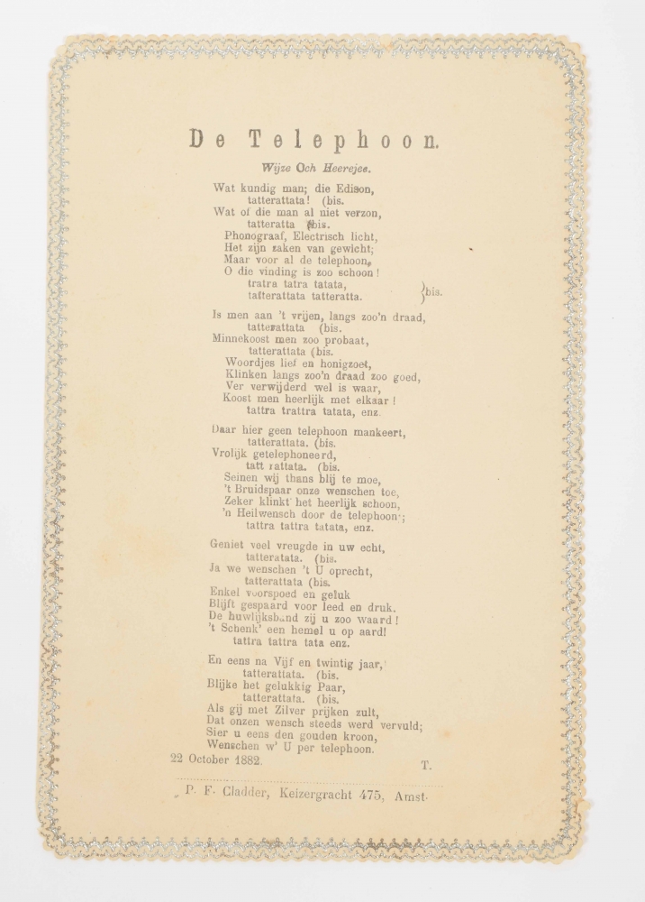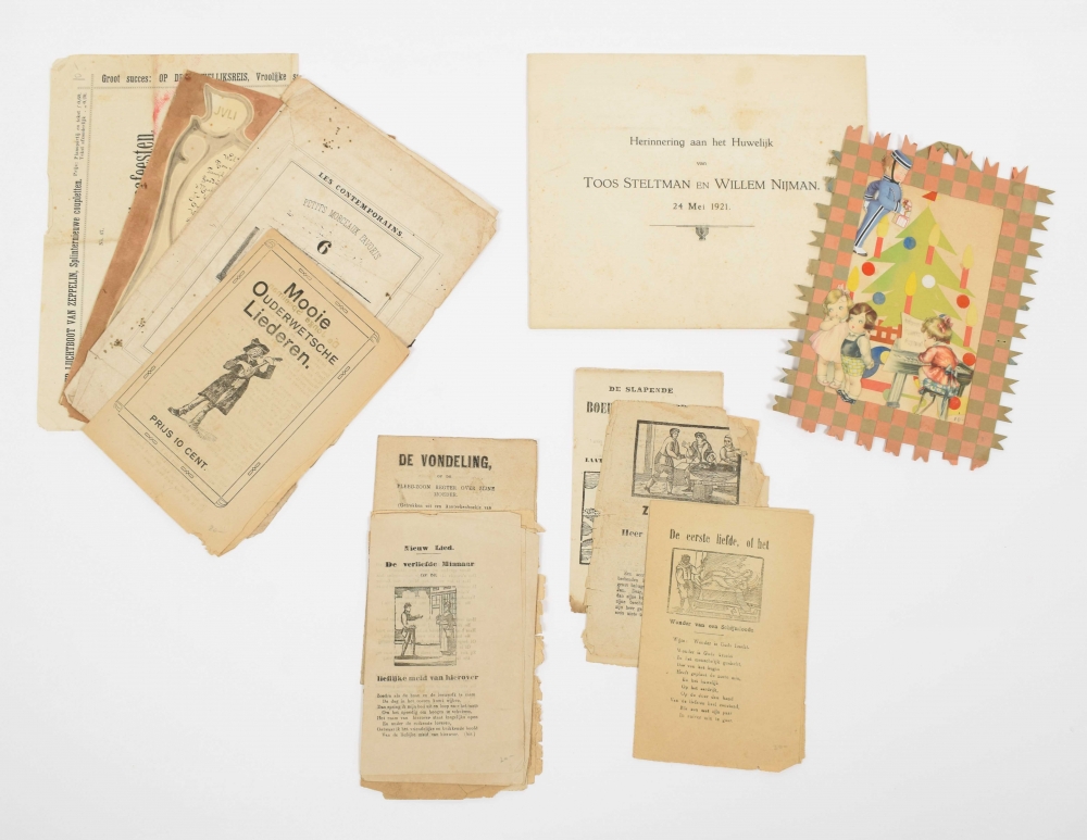 Including several double. Partly without address, else issued/ printed in Amsterdam at J. Baptist Vallegia (several), S. v. Mantgem (several), E. v.d. Geer (several), F.G.L. Holst, P.F. Cladder (titled "De Telephoon" and dated 22 October 1882), F.W. Vislaake (several), Theune & Comp and G. v.d. Linden; in Leeuwarden at Wed. G. Visser, Wed. P. Hoven and J.J. Sterrenberg (several); in Groningen at J.D. van Dijk (with advertisement "Per luchtboot van Zeppelin"), in Deventer at Wed. P. de Lange, in Rotterdam at D. van Sijn, in The Hague at Drukkerij Het Voordeel, in Nijmegen at J.F. Kloosterman, in Roosendaal at F. Rombouts en Zonen (several, incl. copies of the Liederencourant), else "Voor rekening van Bram", "gedrukt bij F.H. van Duijl" and editions by the "Ware Bataven-Loge No. 4. I.O.O.F." (Amsterdam). (total ± 120)