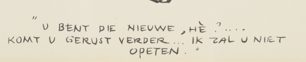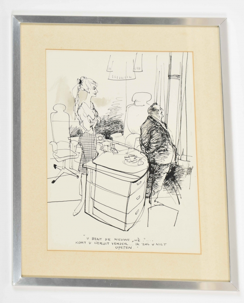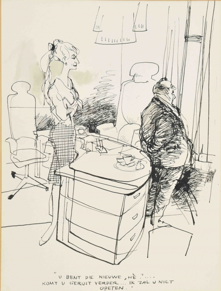A safe working place. "U bent die nieuwe, hè? (...)", c. 1975. India ink on paper, handwritten title '"U bent die nieuwe, hè?.... Komt u gerust verder... Ik zal u niet opeten." ("Aren't you the new one?... Do come along... I won't eat you alive.")