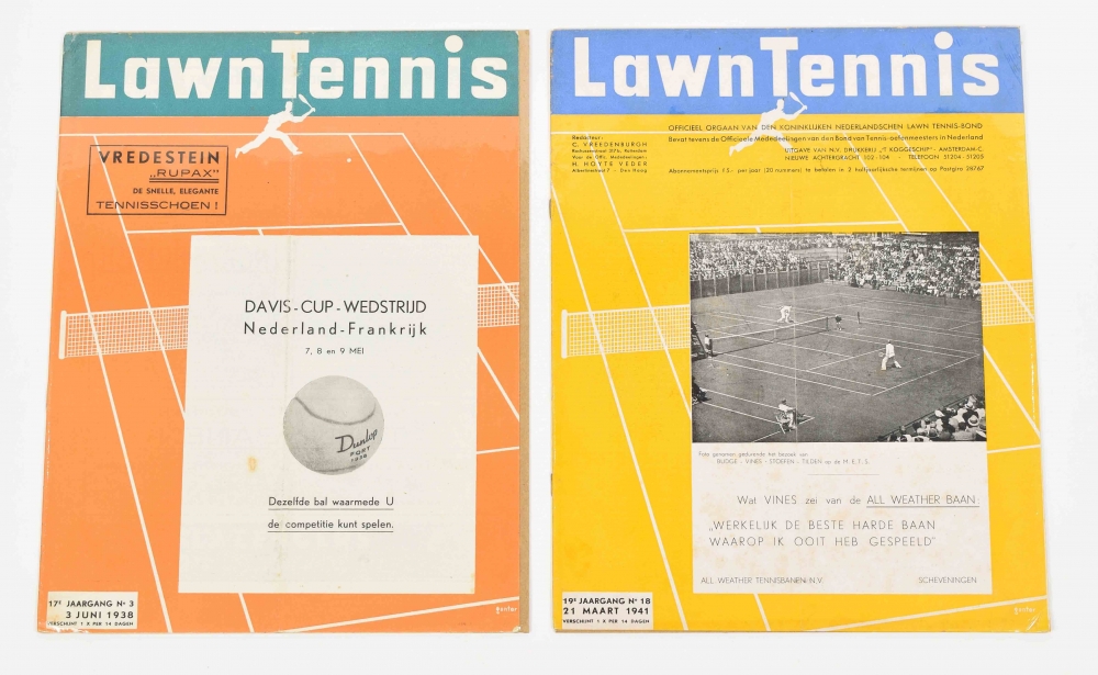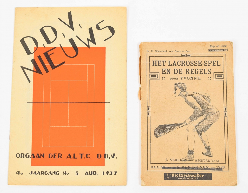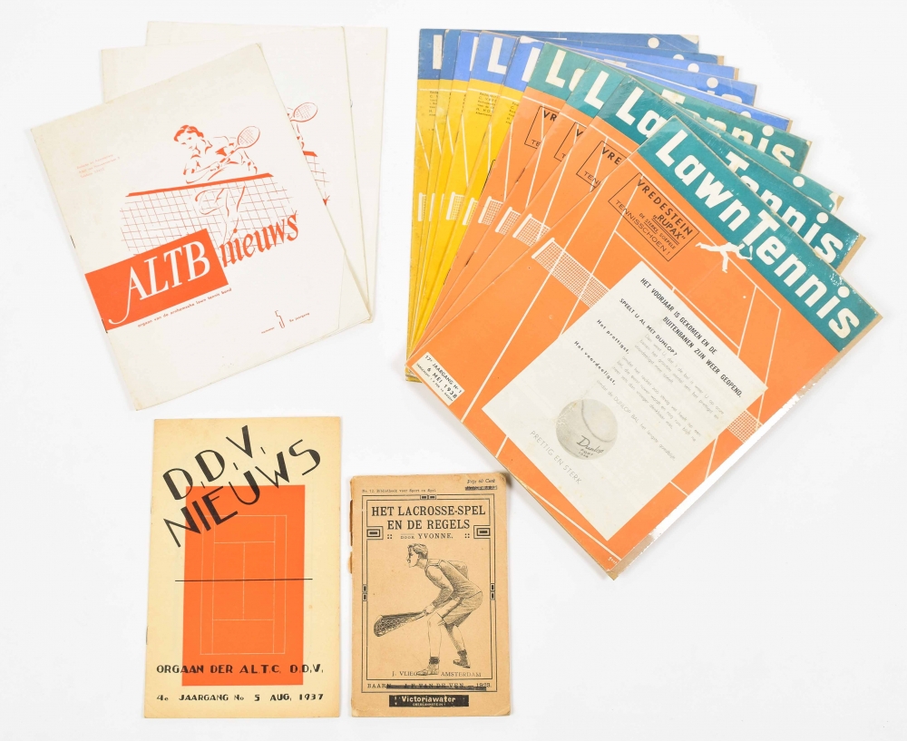 Lawn Tennis. 17th year 1938, 4 nos. and 19th year 1940, 6 nos. + D.D.V. Nieuws. Orgaan der A.L.T.C. D.D.V. 4th year no. 5 Aug. 1937. Stapled + ALTB nieuws. Orgaan van de Arnhemsche Lawn Tennis Bond. Year 5 no. 5 (2x) and no. 6. Stapled - and Het lacrosse-spel en de regels, door Yvonne. No. 72 Bibliotheek voor Sport en Spel. J. Vlieger, Amsterdam (crossed out: Baarn, J.F. van de Ven, 1923). Spine wrapper dam., else good.