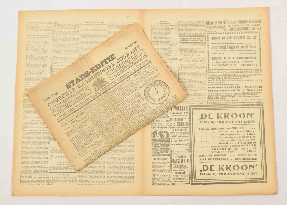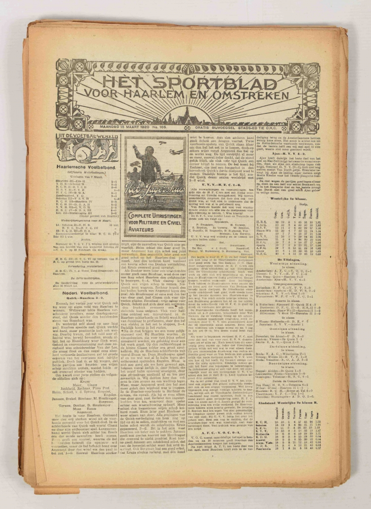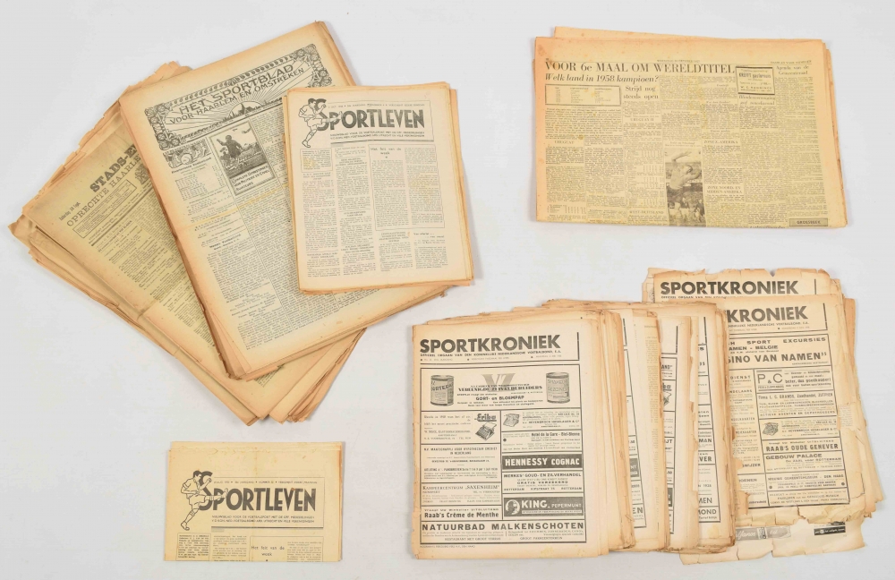 Gratis bijvoegsel stads-editie Oprechte Haarlemsche Courant, 30 nos., 1920-1921 + several nos. of the Oprechte Haarlemsche Courant, 1921 - and several loose newspaper editions + Officiële Mededelingen Koninklijke Nederl. Voetbalbond afdeling Gouda, ± 30 nos. 1964-1965 + Clubblad Noordster, Oude Pekela, 1920 + Sportleven, var. nos. 1950s - and Sportkroniek, several dozens of nos. 1930s-40s.