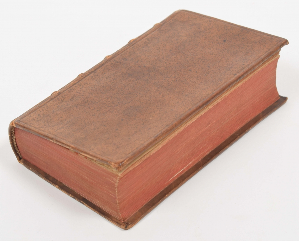 With the former Translations diligently revised. het nieuwe Testament, ofte alle Boecken des Nieuwen verbonts onzes Heeren Jesu Christi. Volgens het Besluyt der Sinode van Dordrecht in de Jare 1618 , en 1619. t' Amsterdam, J.C. Schoots van Cappelle, 1754. (2), 580 p. 17 x 10 cm. In orig. leather with ribbed back. Bilingual publication. Clean copy.