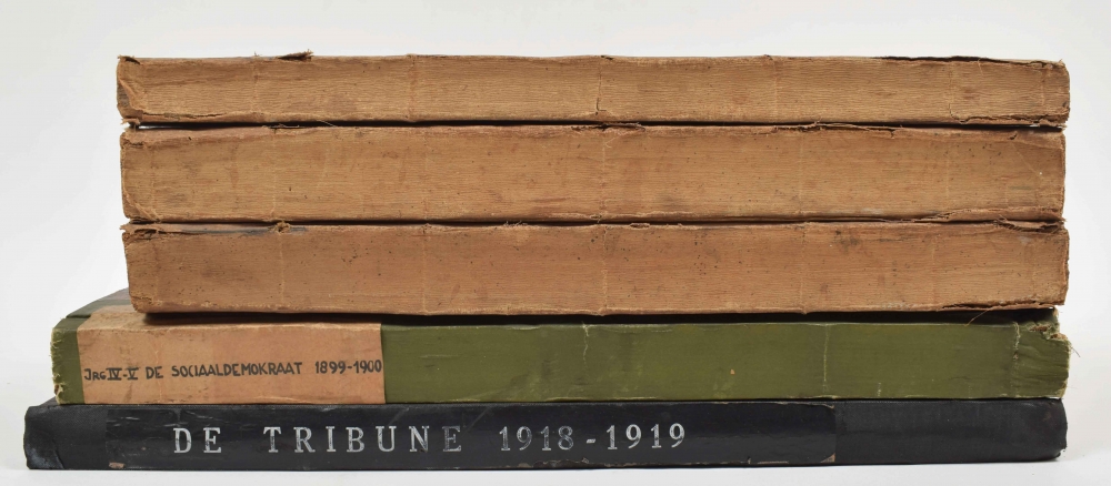 Hoofdredakteur P.J. Troelstra. Year 1 (1900), no. 1-112; year 3 (1903), no. 842-991; year 4 (1903), no. 992-1147. Uniform halfcloth, folio (bindings worn) + De Sociaaldemokraat. Orgaan der Sociaaldemokratische Arbeiderspartij in Nederland. Volume 4th year no. 235 (3 January 1899) to 5th year no. 418 (22 March 1900). Halfcloth (several pp. torn) - and De Tribune. Revolutionair-socialistisch Volksblad. Year 12 (1919), no. 154-305. Halfcloth (no. 252 loosely inlaid).