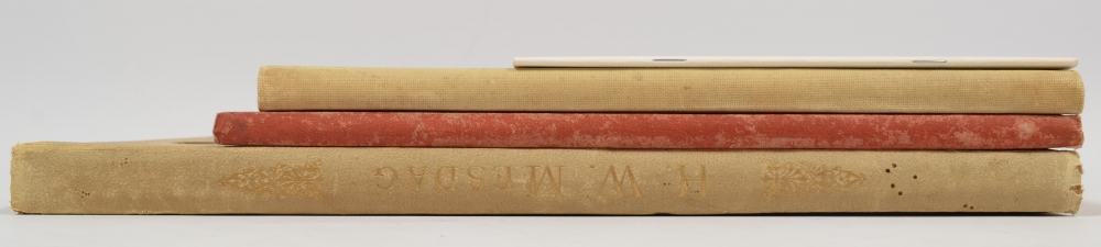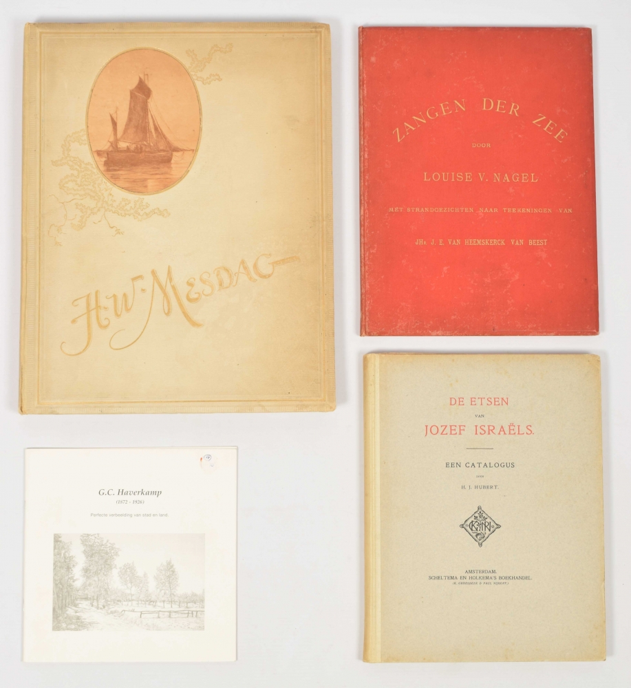 Occ. small tears/ mild creasing; protective sheets partly lacking. Binding sl. soiled/ tanned and trifle worn at spine ends and outer corners; (2) Zangen der zee. Door Louise V. Nagel. Met strandgezichten naar teekeningen van Jhr. J.E. Van Heemskerck van Beest. The Hague, W. Cremer, 1888, 53,(2) p., with 9 plates, original lithographed wrapper, all edges gilt, loose as issued in gilt-lettered original cloth portfolio, folio. Lacks binding cord, else inside very good. Lacks tie of portfolio, else with some superficial wear; (3) De etsen van Jozef Israëls. Een catalogus door H.J. Hubert. Amsterdam, Scheltema en Holkema, (1908), printed in 275 numbered copies, (4),55 p. and loosely added letterpress "bericht aan den lezer", with 38 plates, original halfcloth, 4to (minor defects). And with 1 more on G.C. Haverkamp. (total 4)