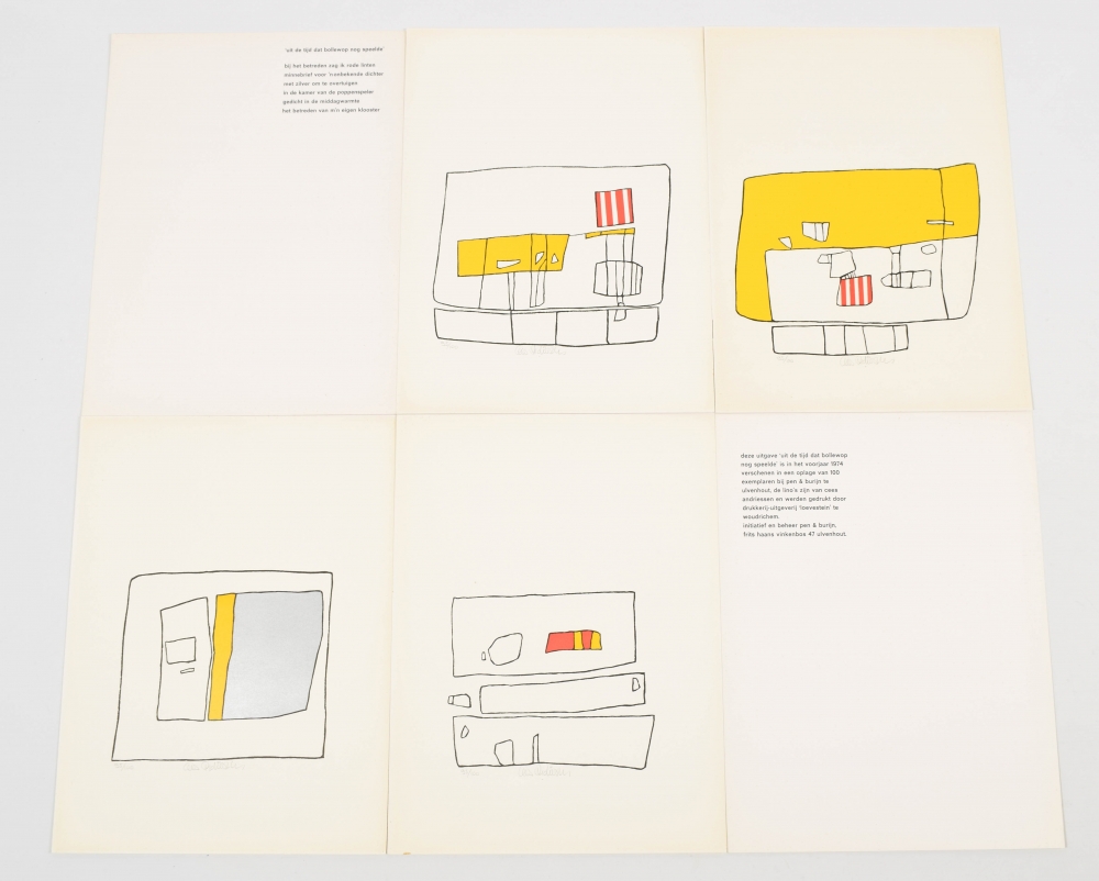 (2) Uit de tijd dat bollewop nog speelde. Ulvenhout, Pen & Burijn, 1974, issued in 100 numbered and signed copies (this is no. 95), letterpress poem and colophon and 4 (of 6) colour linocuts by Cees Andriessen, loose-leafed as issued, folio. (total 2)