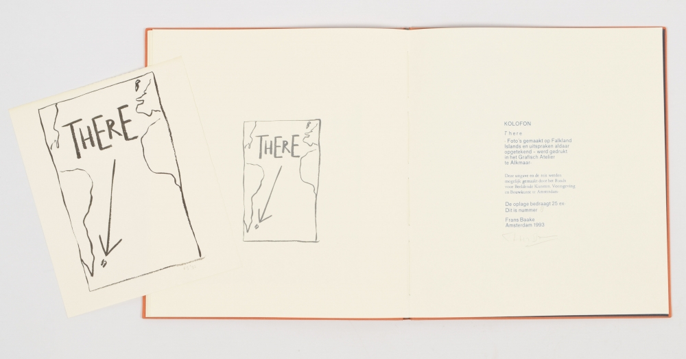 Binding waterstained and affected on/ near spine; (2) Frans Baake. tHere* *Falkland Islands. Foto's gemaakt op Falkland Islands en uitspraken aldaar opgetekend. Amsterdam, the artist, 1993, printed in 25 numbered and signed copies, (20) p., screenprinted photographic ills. and loosely inlaid monogrammed multiple ("There"), original cloth, large 4to (spine sl. faded). With inlaid invitation. With 2 similar other works. (total 4)