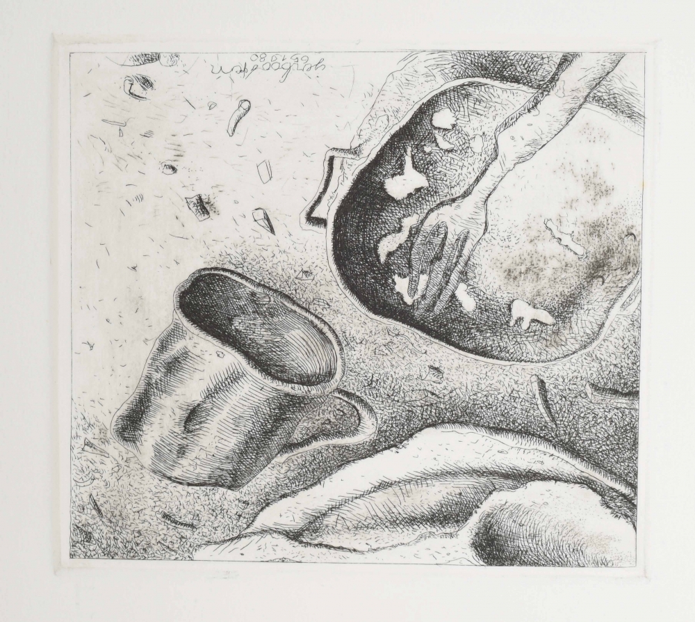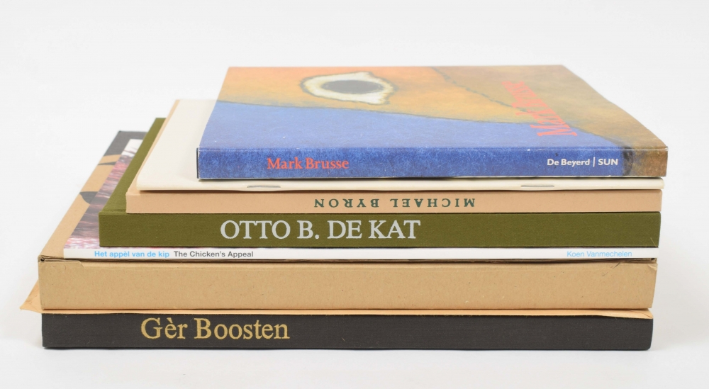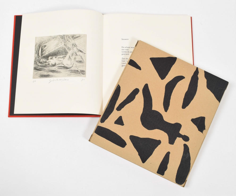 (2) Wiel Kusters en Gèr Boosten in De dood van Maria. Nuth, Drukkerij Rosbeek, 1991, issued in 300 copies for the 5th anniversary of the publisher, unpaginated, with signed etching numbered 47, original cloth, large 4to, in cardboard slipcase (like new). (3) Mark Brusse. Frits Bless, Rudy Kousbroek, Pierre Restany. Breda/ Nijmegen, De Beyerd/ Sun, 1999, 96 p., original cardboard with dust jacket, oblong 4to. With inlaid in envelope 3 signed prints in unknown medium dated '93, each with annotation in pencil "H.C." And with 4 more. (total 7)