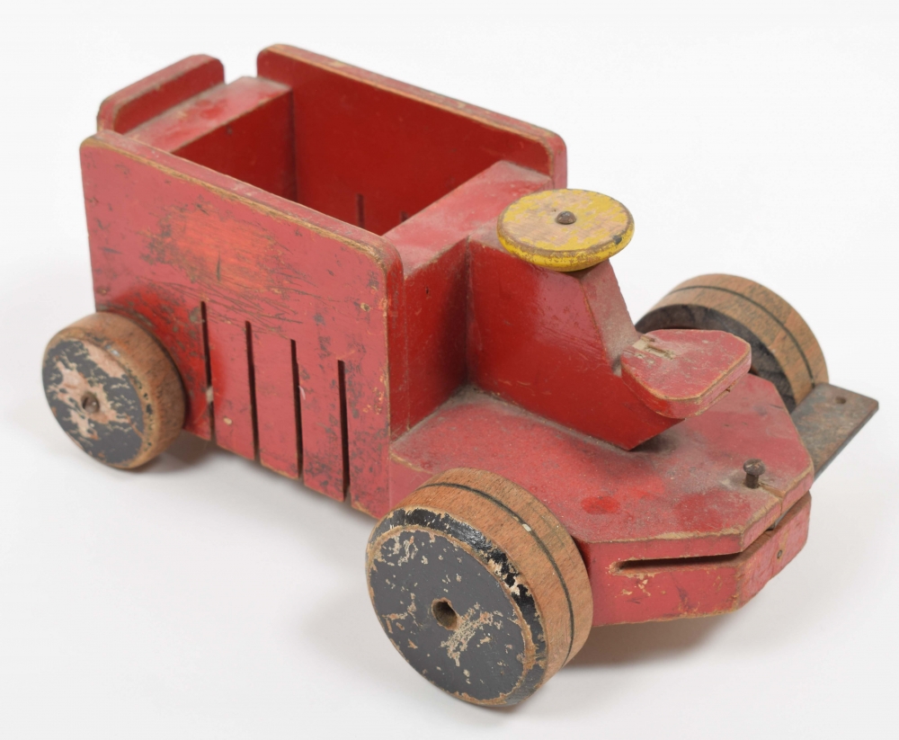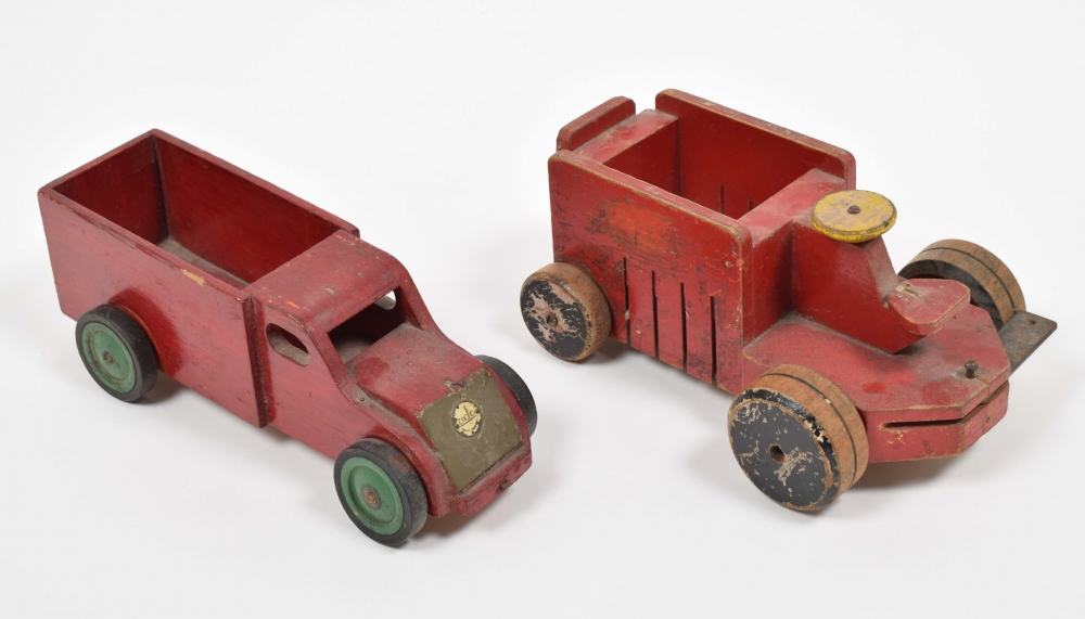 Two wooden cars, both marked. One of the cars presumably with partly new lacquering. Else the usual wear and traces of use.