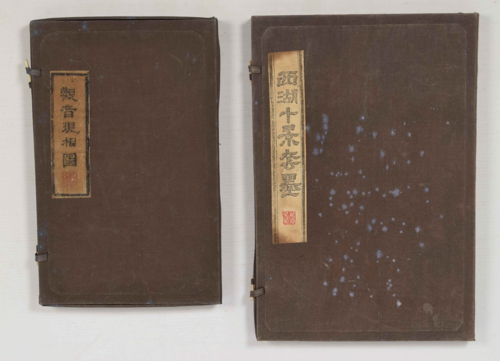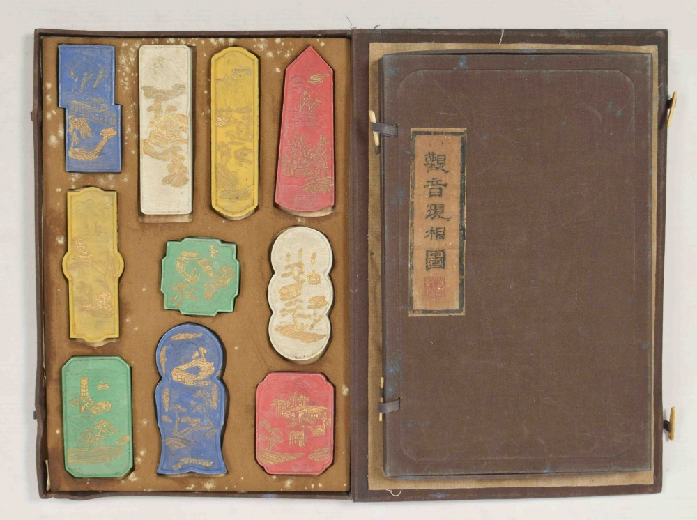 various shapes and sizes with images of scenes with buildings in landscapes, Chinese characters on reverse and on the sides, preserved in the original cloth box with pre-shaped openings, label and two clamps, 32.5 x 22 x 2 cm.
